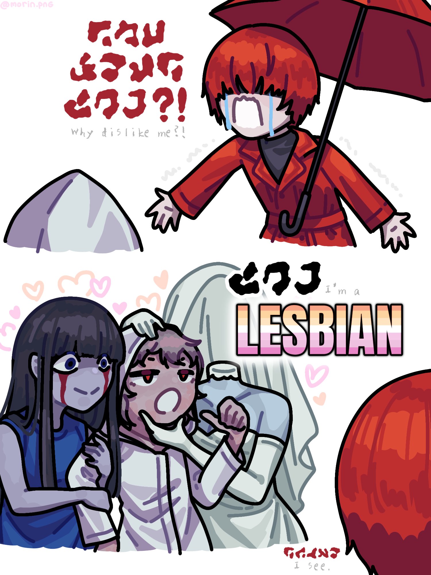 1boy 3girls arm_hug black_eyes black_hair blood bloody_tears bridal_veil brown_hair coat commentary crying dress english_commentary english_text adashino_adami highres homicipher homicipher_text hood hood_up long_hair loving_aura morin_png mr._scarletella ms._blue-clad multiple_girls raincoat red_coat red_hair red_umbrella short_hair simple_background the_bride_(homicipher) umbrella veil wedding_dress white_background yuri