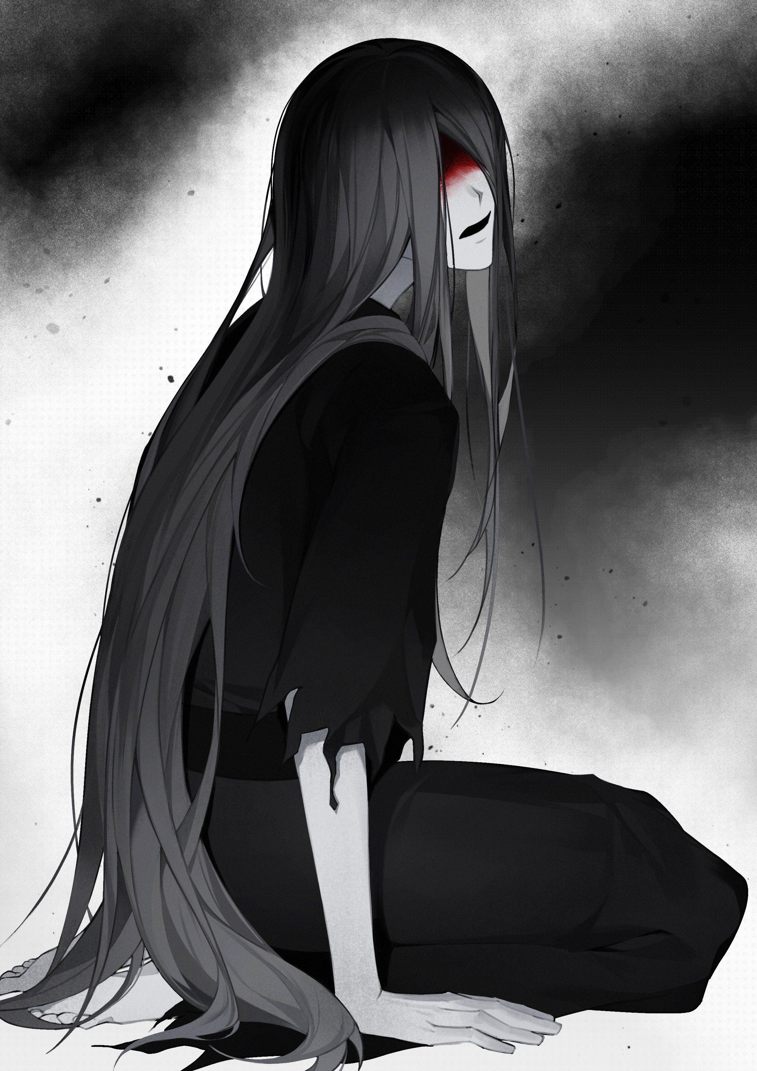 1boy absurdres black_hair black_kimono blood blood_on_face facing_back facing_viewer full_body hashtag-only_commentary highres homicipher japanese_clothes kimono long_hair male_focus mr._crawling seiza sitting solo very_long_hair zhi44zhi
