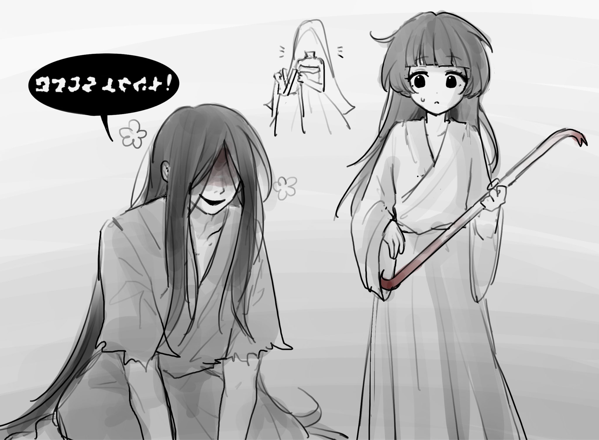 1boy 2girls blood blood_on_face chinese_commentary commentary_request crowbar grey_background happy_aura adashino_adami highres holding holding_crowbar homicipher homicipher_text japanese_clothes kimono long_hair looking_at_another mr._crawling multiple_girls neko_(yuayew6upxukfre) spot_color the_bride_(homicipher) very_long_hair