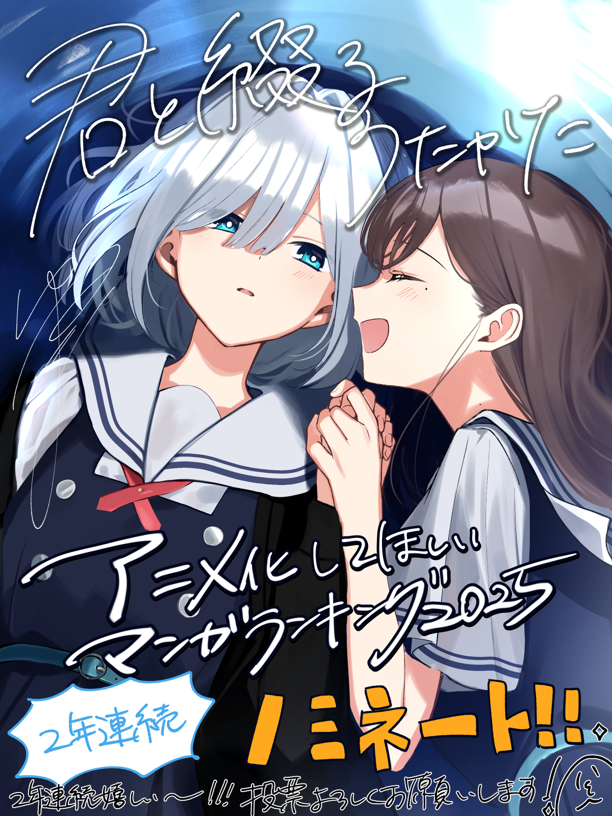 2girls asaka_kaori belt black_cardigan blue_belt blue_dress blue_eyes blush brown_hair cardigan closed_eyes commentary_request dress hair_between_eyes highres holding_hands hoshikawa_shizuku kimi_to_tsuzuru_utakata long_hair medium_hair mole mole_on_neck mole_under_eye multiple_girls open_cardigan open_clothes open_mouth parted_lips pinafore_dress sailor_collar school_uniform shirt short_sleeves sleeveless sleeveless_dress translation_request white_hair white_sailor_collar white_shirt yuama