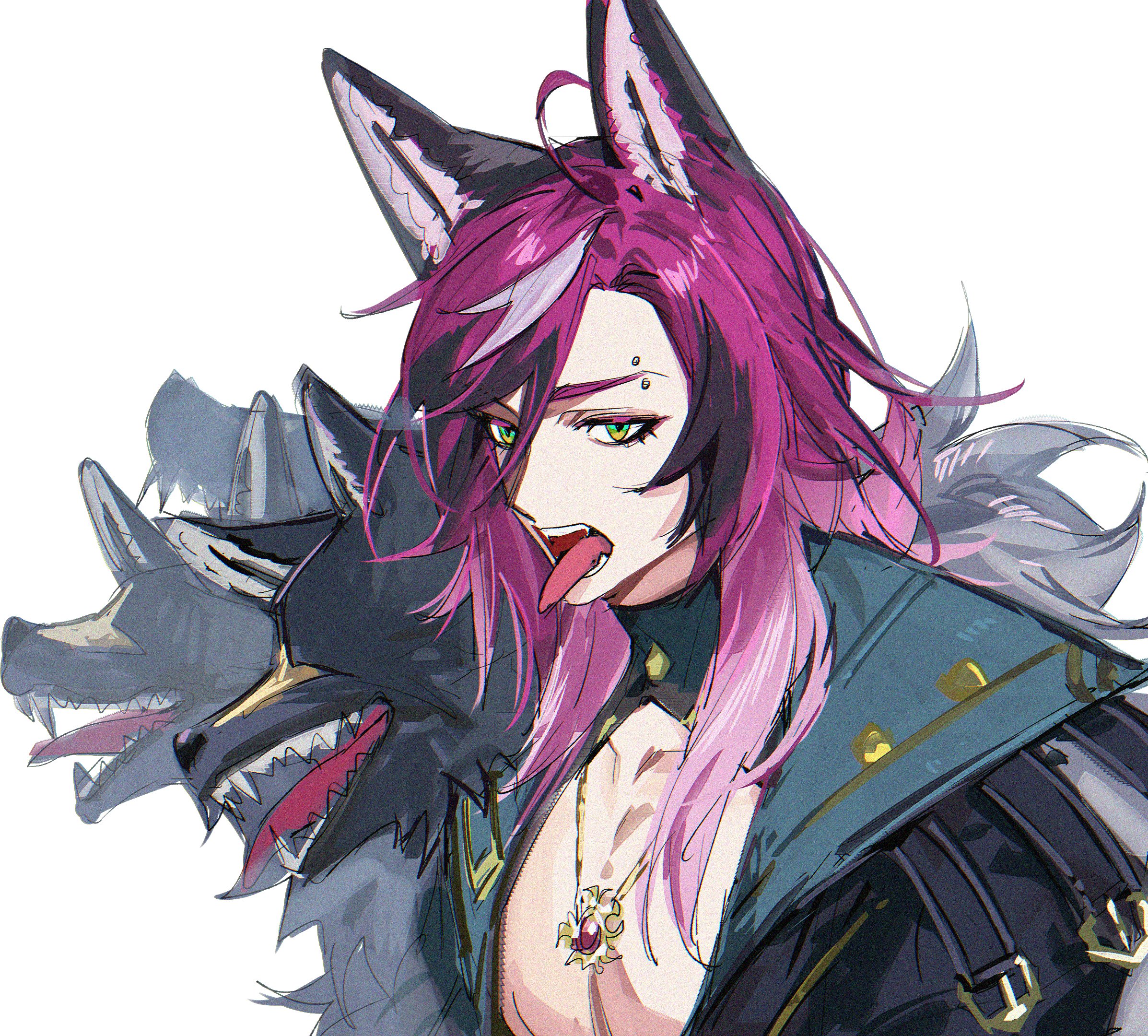 1boy ahoge animal_ears black_coat black_hair coat collarbone collared_coat commentary doppio_dropscythe doppio_dropscythe_(2nd_costume) eyebrow_piercing face_piercing fangs fur-trimmed_coat fur_trim green_eyes hair_between_eyes hair_over_shoulder highres jewelry kaohom503 long_hair looking_at_viewer male_focus multicolored_eyes multicolored_hair necklace nijisanji nijisanji_en official_alternate_costume open_clothes open_coat open_mouth parted_bangs pectoral_cleavage pectorals piercing purple_hair simple_background solo streaked_hair untranslatable_commentary teeth tongue tongue_out upper_body virtual_youtuber white_background white_hair wolf wolf_ears yellow_eyes