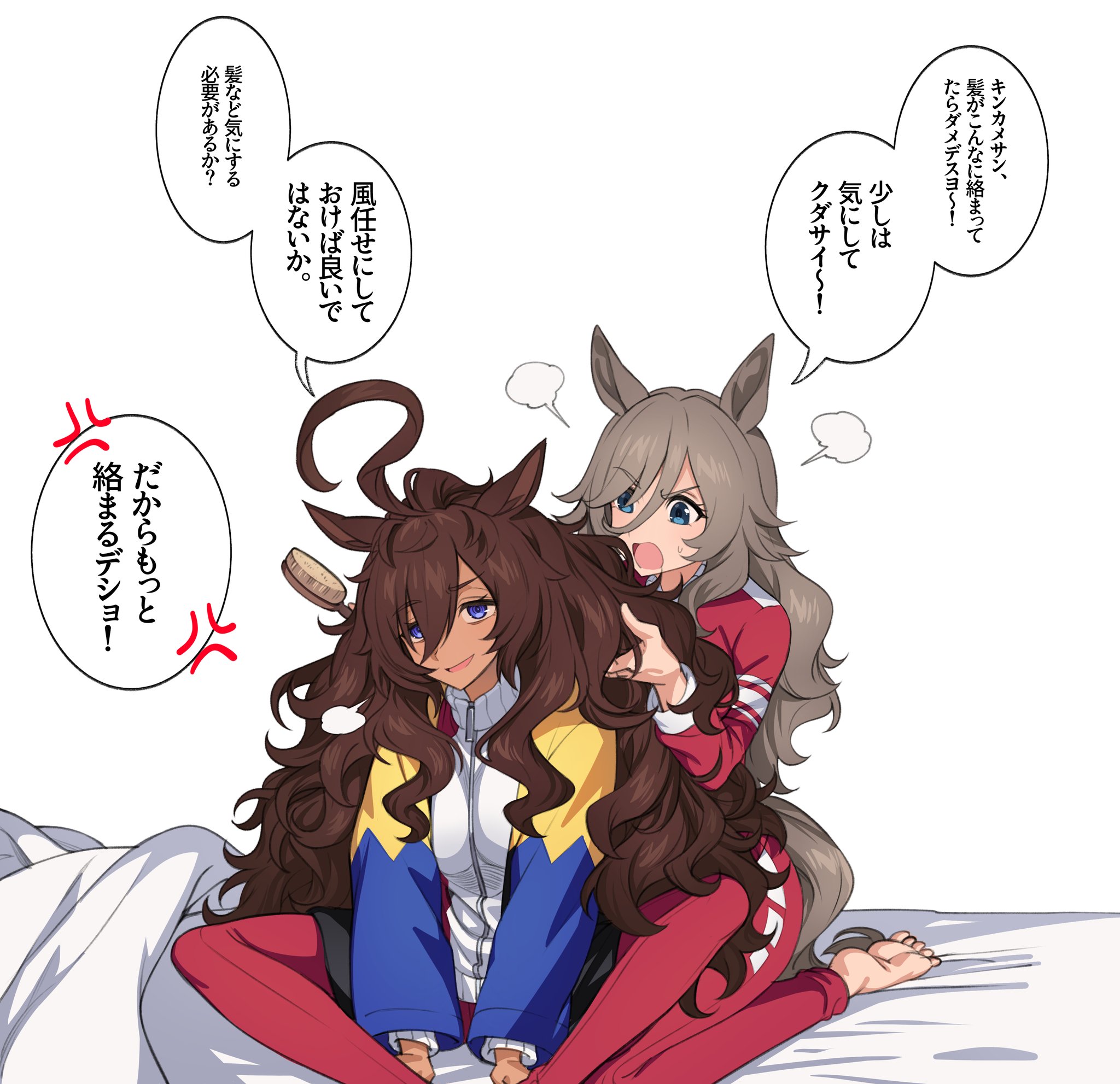 2girls ahoge alternate_costume alternate_hairstyle anger_vein animal_ears bed blanket blue_eyes brown_hair commentary dark-skinned_female dark_skin fukuro_(maruaru00) hair_brush highres holding holding_hair_brush horse_ears horse_girl huge_ahoge king_kamehameha_(umamusume) messy_hair multiple_girls on_bed perry_steam_(umamusume) puff_of_air purple_eyes red_track_suit sitting speech_bubble spoken_anger_vein tail track_suit translation_request umamusume umamusume:_beginning_of_a_new_era
