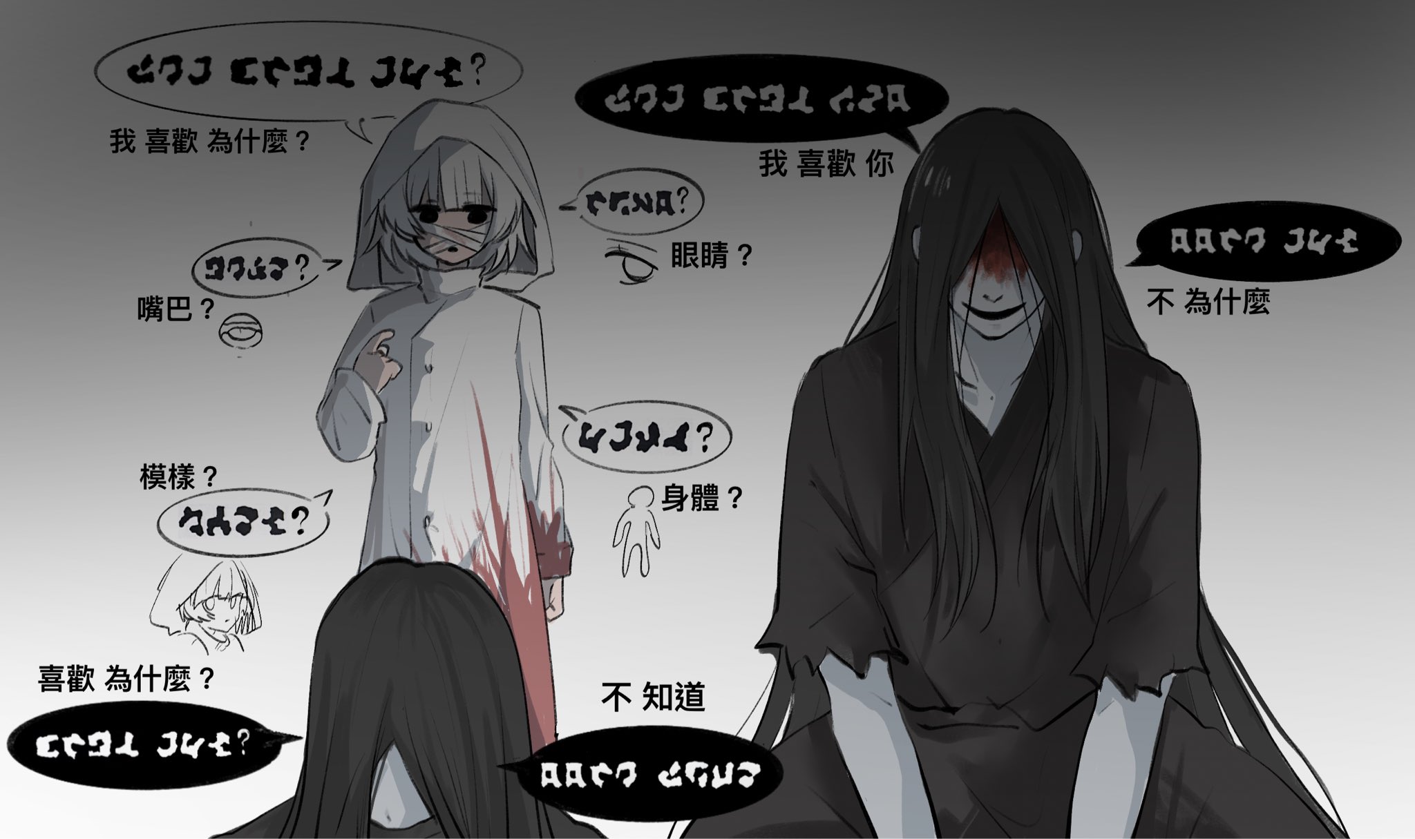 1boy 1girl black_hair black_kimono blood blood_on_clothes blood_on_face chinese_commentary chinese_text commentary_request gradient_background grey_background adashino_adami highres homicipher homicipher_text japanese_clothes kimono long_hair mr._crawling neko_(yuayew6upxukfre) raincoat short_hair translation_request very_long_hair white_hair