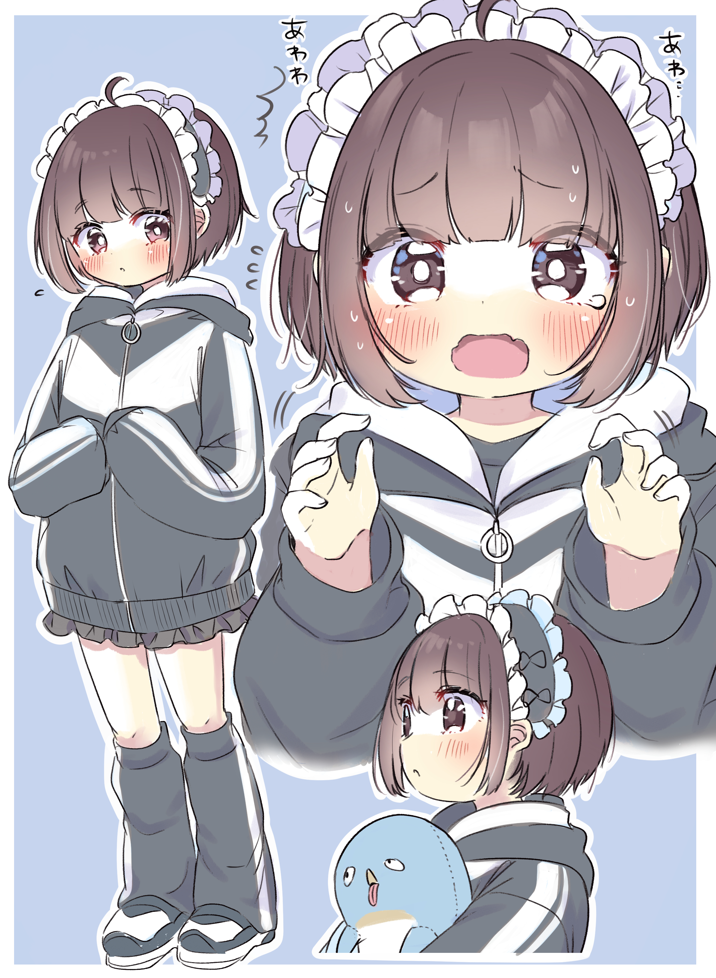1girl absurdres ahoge akane_riu bad_id bad_twitter_id black_jacket blue_background blush bob_cut border bright_pupils brown_eyes brown_hair embarrassed flying_sweatdrops full_body hairband highres holding holding_stuffed_toy hood hood_down hooded_jacket jacket lolita_hairband loose_socks open_mouth original outline own_hands_together skirt socks solo standing stuffed_animal stuffed_penguin stuffed_toy tearing_up tears white_border white_outline white_pupils zipper_pull_tab