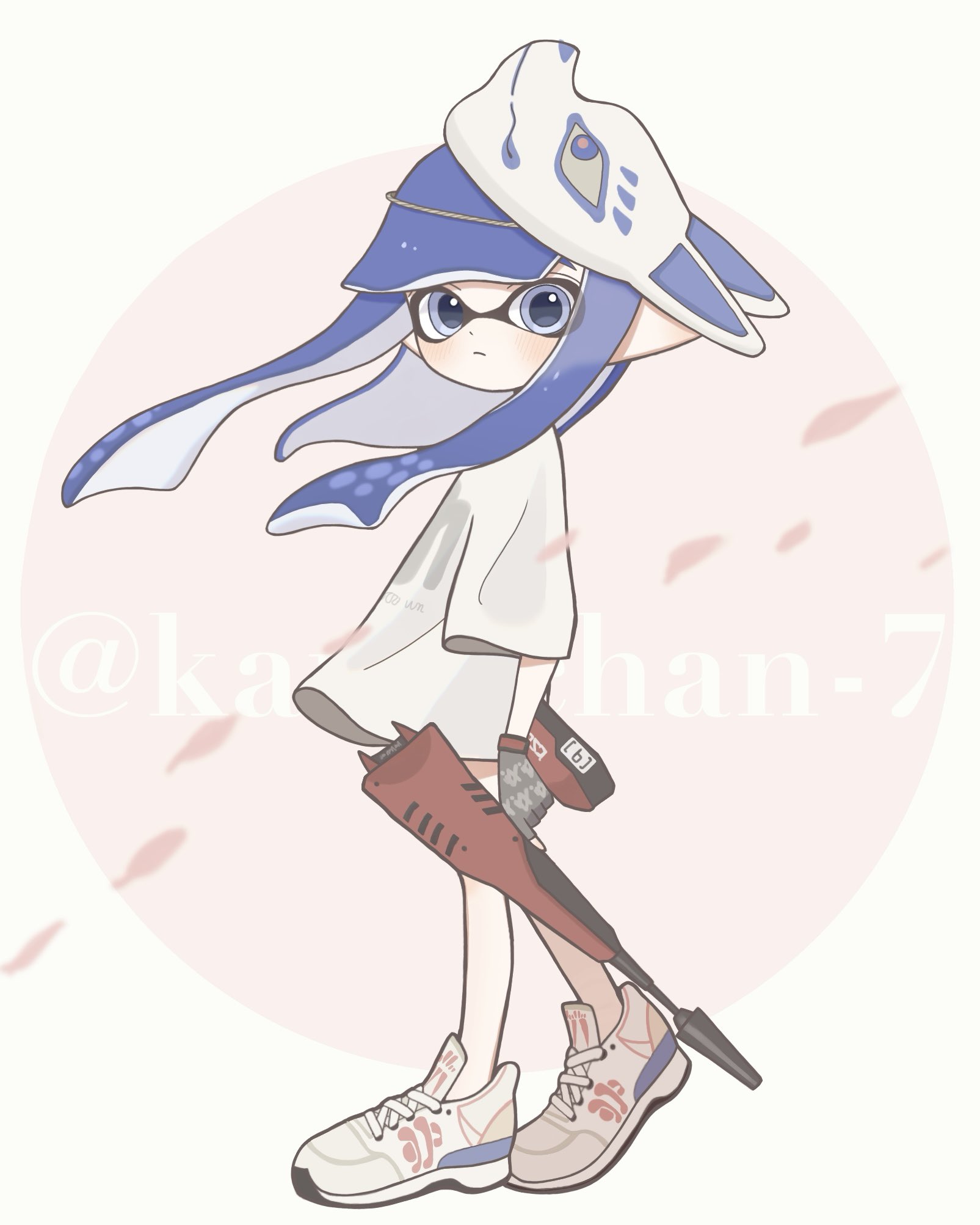1girl blue_eyes blue_hair blunt_bangs commentary_request cross-laced_footwear dualie_squelchers_(splatoon) falling_petals fox_mask full_body highres inkling inkling_girl inkling_player_character long_hair looking_at_viewer mask nintendo osakanagumi11 petals pointy_ears print_shirt shirt shoes solo splatoon_(series) splatoon_3 standing t-shirt tentacle_hair unworn_mask white_shirt white_shoes