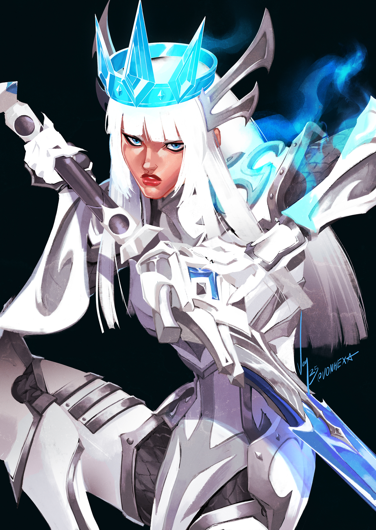 1girl armor blue_eyes crown fire gauntlets gloves highres hime_cut holding holding_sword holding_weapon long_hair looking_at_viewer magic magik_(eldritch_armor)_(x-men) magik_(x-men) marvel marvel_rivals official_alternate_costume shoulder_armor solo sword vontvirus weapon white_hair x-men
