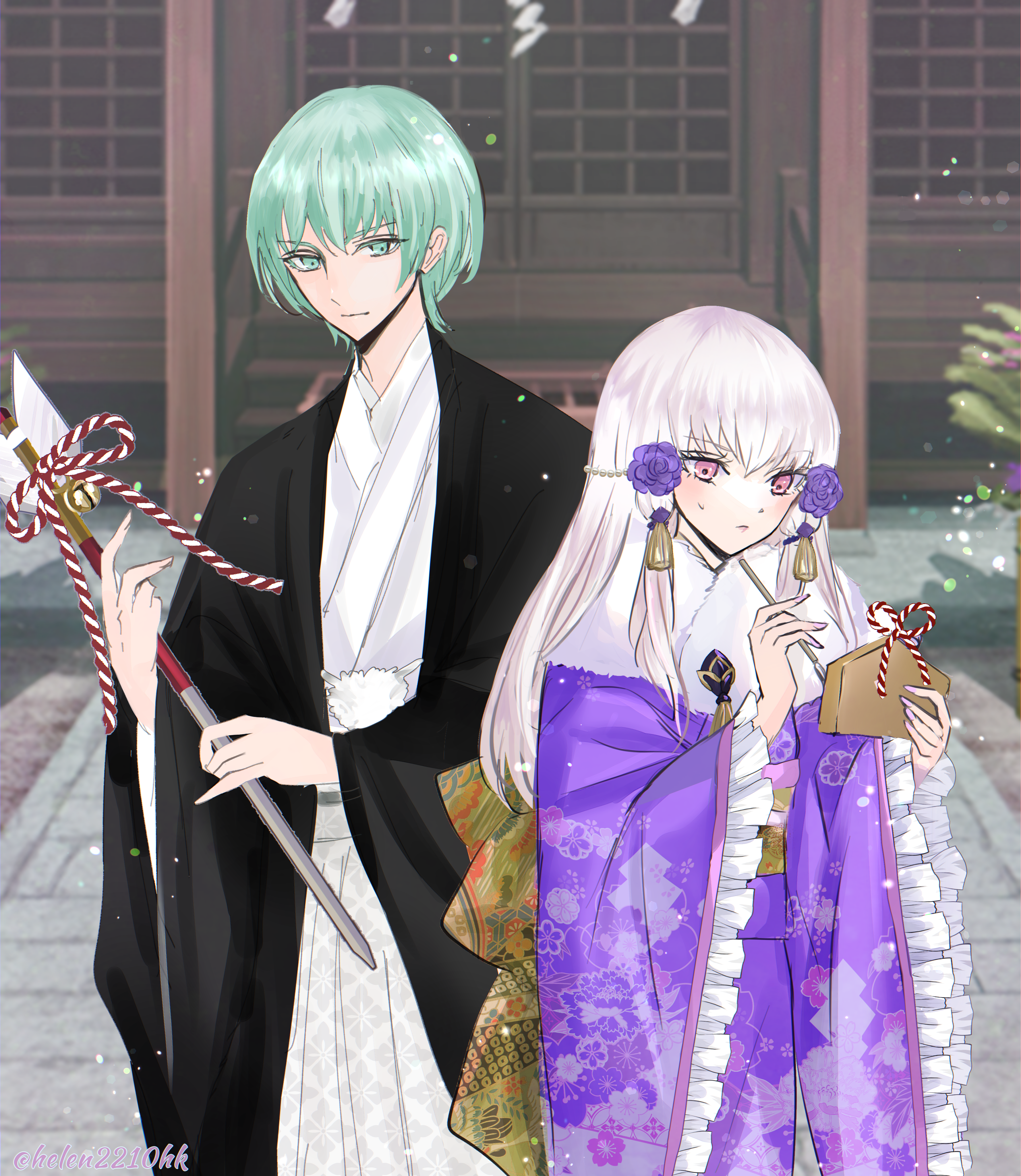 1boy 1girl absurdres alternate_costume black_haori blush male_byleth_(awakened)_(fire_emblem) male_byleth_(fire_emblem) closed_mouth commentary_request fire_emblem fire_emblem:_three_houses flower frilled_sleeves frills green_eyes green_hair hair_flower hair_ornament haori height_difference helen_(helen2210hk) highres holding japanese_clothes kimono long_hair looking_at_another lysithea_von_ordelia nintendo obi pink_eyes purple_flower sash short_hair sweatdrop white_hair wide_sleeves