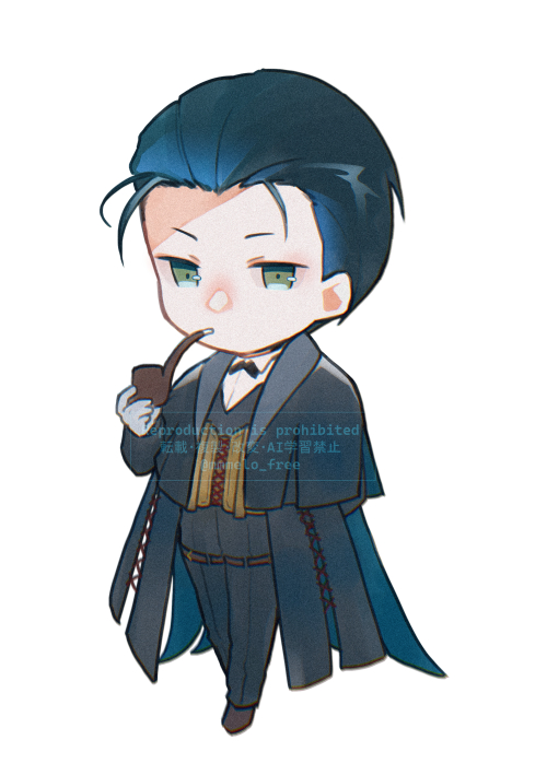1boy arm_behind_back black_bow black_bowtie black_capelet black_pants black_vest blue_hair bow bowtie brown_corset brown_footwear capelet chibi corset fate/grand_order fate_(series) full_body green_eyes hand_up male_focus pants sherlock_holmes_(fate) shirt short_hair simple_background smoking_pipe solo twitter_username vest white_background white_shirt yoczkw