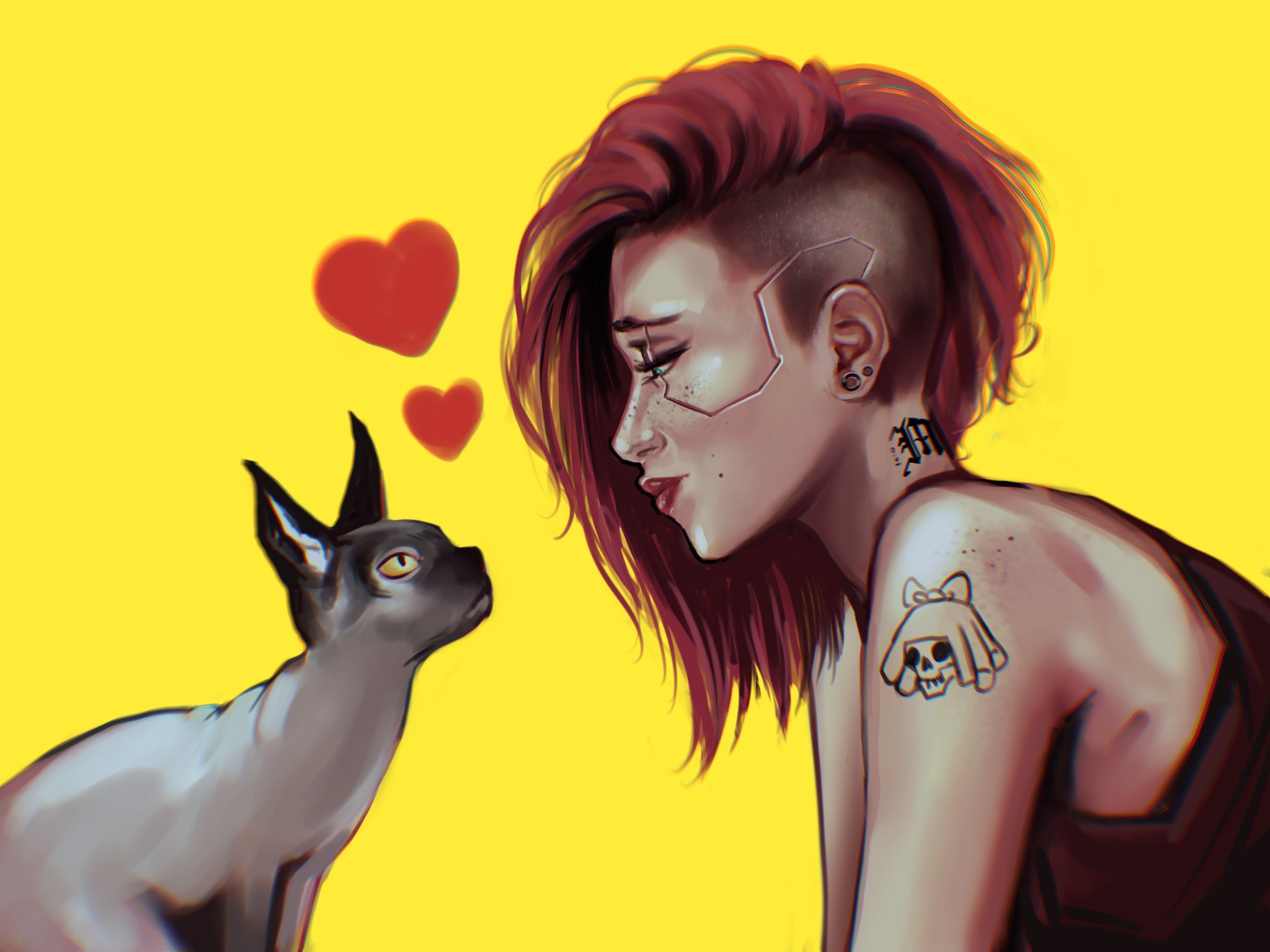 1girl asymmetrical_hair cat cyberpunk cyberpunk_(series) cyberpunk_2077 dilara_ozden heart highres looking_at_animal neck_tattoo red_hair red_tank_top shoulder_tattoo sidecut simple_background tank_top tattoo undercut v_(cyberpunk) valerie_(cyberpunk) yellow_background
