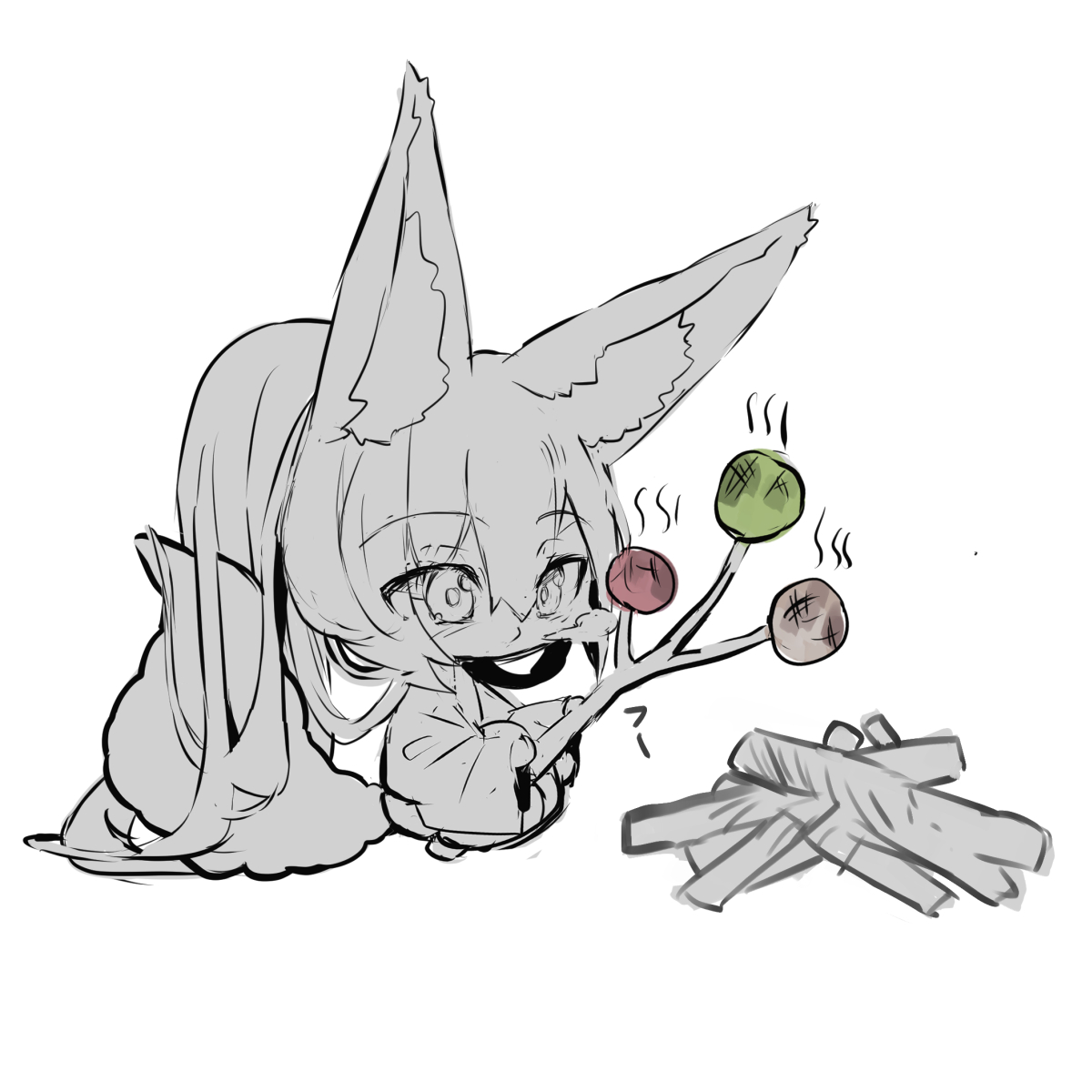 1girl absurdly_long_hair animal_ear_fluff animal_ears blowing_on_food branch campfire chibi closed_mouth commentary_request fox_ears fox_girl fox_tail full_body hair_between_eyes highres holding holding_branch japanese_clothes kimono long_hair long_sleeves monochrome original ponytail simple_background sitting sketch solo tail very_long_hair white_background wide_sleeves yuuji_(yukimimi)