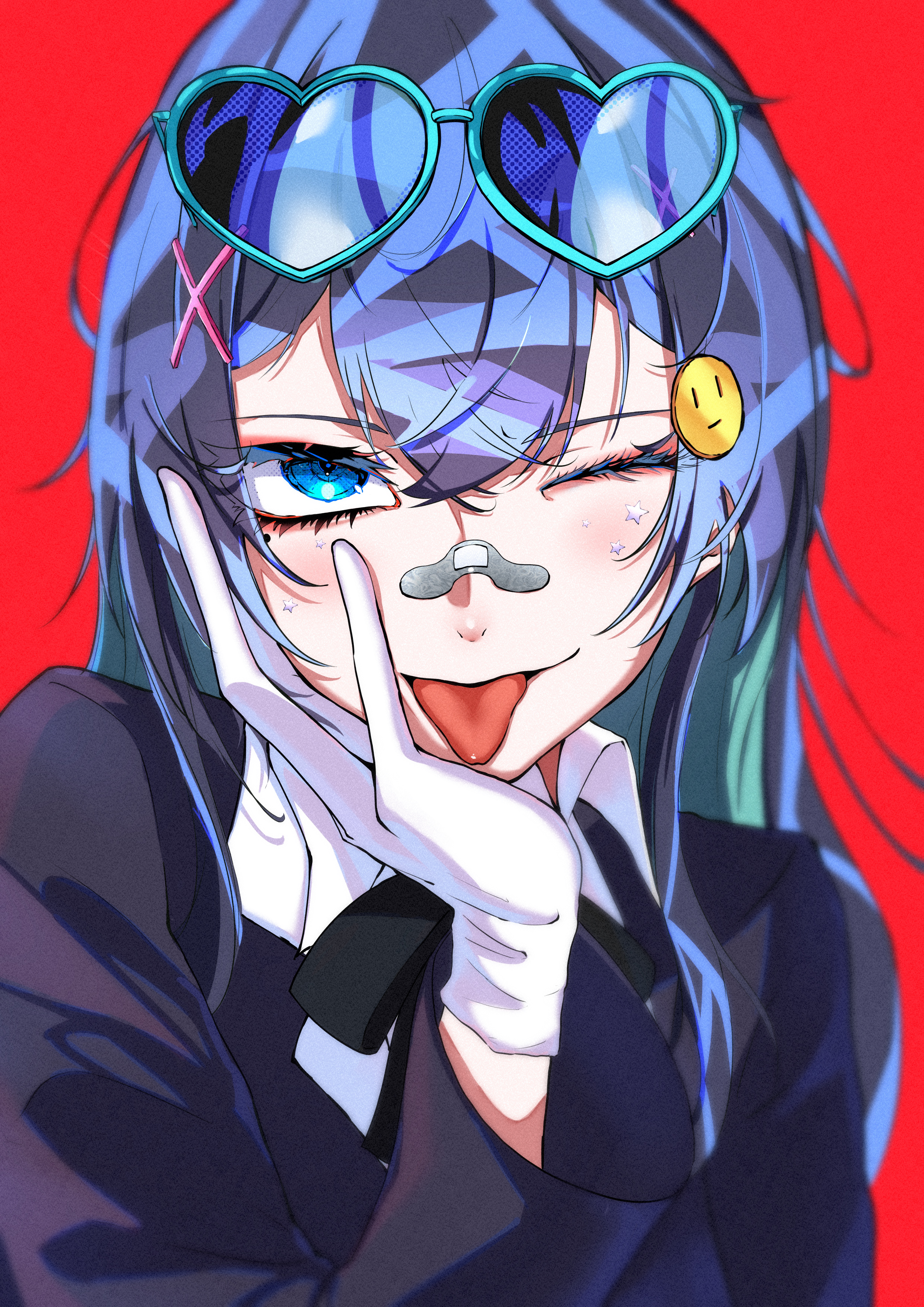1girl absurdres ado_(utaite) bandaid bandaid_on_face bandaid_on_nose black_bow black_bowtie blue-tinted_eyewear blue_eyes blue_hair bow bowtie chando_(ado) commentary english_commentary eyewear_on_head facial_mark gloves ha-chan_(ado) hair_between_eyes heart heart-shaped_eyewear highres long_hair mixed-language_commentary mole mole_under_eye red_background sido_(sido_mrtsnkc) solo star_(symbol) star_facial_mark sunglasses tinted_eyewear upper_body utaite white_gloves
