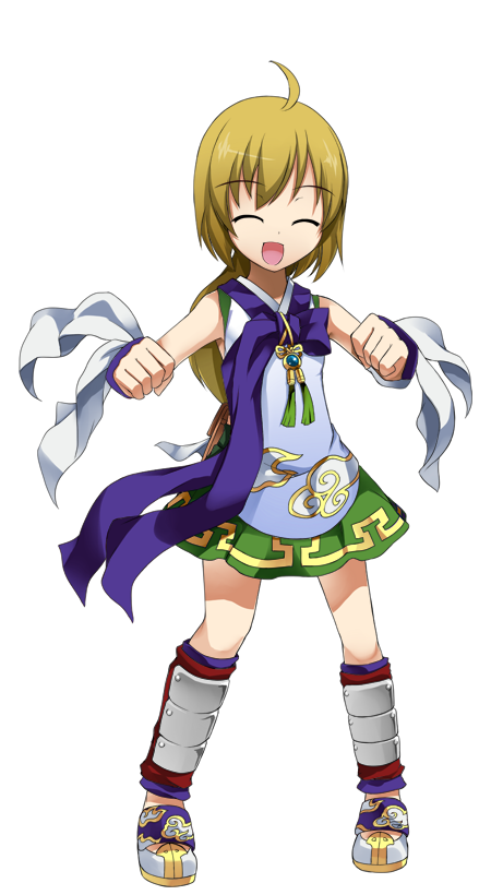 1girl :d ahoge blonde_hair bow bowtie clenched_hands closed_eyes fingerless_gloves flat_chest full_body gloves green_skirt grey_shirt large_variant_set long_hair official_art open_mouth purple_bow purple_bowtie purple_gloves purple_shoes purple_socks ragnarok:_guild_masters ragnarok_online shin_guards shiratama_dango shirt shoes simple_background skirt sleeveless sleeveless_shirt smile socks solo taekwon_(ragnarok_online) tassel transparent_background variant_set