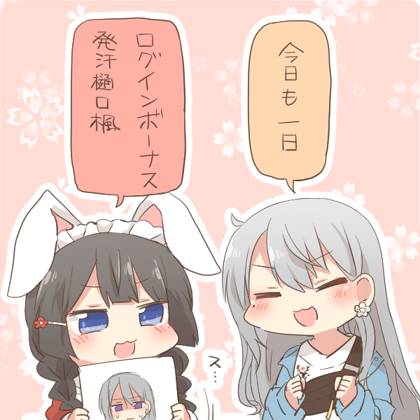2girls :d animal_ears black_hair blue_eyes blue_jacket blush braid chibi clenched_hands closed_eyes fake_animal_ears fanny_pack floral_background flower grey_hair hair_between_eyes hair_flower hair_ornament hairclip higuchi_kaede jacket long_hair long_sleeves low_twintails maid_headdress mole mole_under_eye multiple_girls nijisanji open_clothes open_jacket open_mouth outline pink_background puffy_long_sleeves puffy_sleeves rabbit_ears rebecca_(keinelove) red_flower shirt sleeves_past_wrists smile translation_request tsukino_mito tsukino_mito_(maid) twin_braids twintails upper_body v-shaped_eyebrows very_long_hair virtual_youtuber white_outline white_shirt