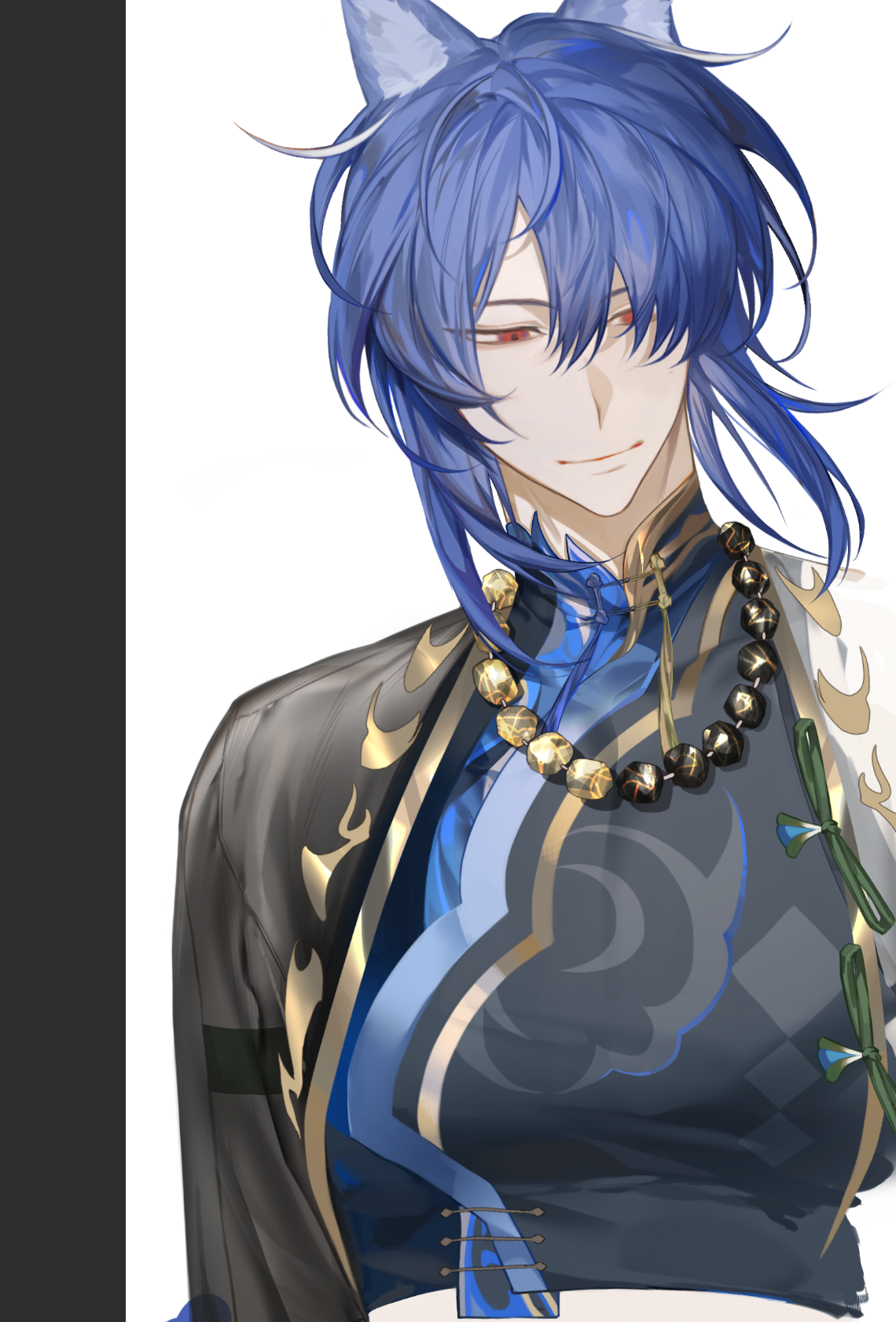 1boy animal_ears bead_necklace beads black_shirt blue_hair chinese_commentary closed_mouth commentary_request crop_top gold_trim hair_between_eyes highres jacket jewelry jiangyueegoshi male_focus medium_hair multicolored_jacket necklace open_clothes open_jacket red_eyes shirt smile solo two-tone_jacket upper_body wolf_ears xia_zhao yong_yue_fengya