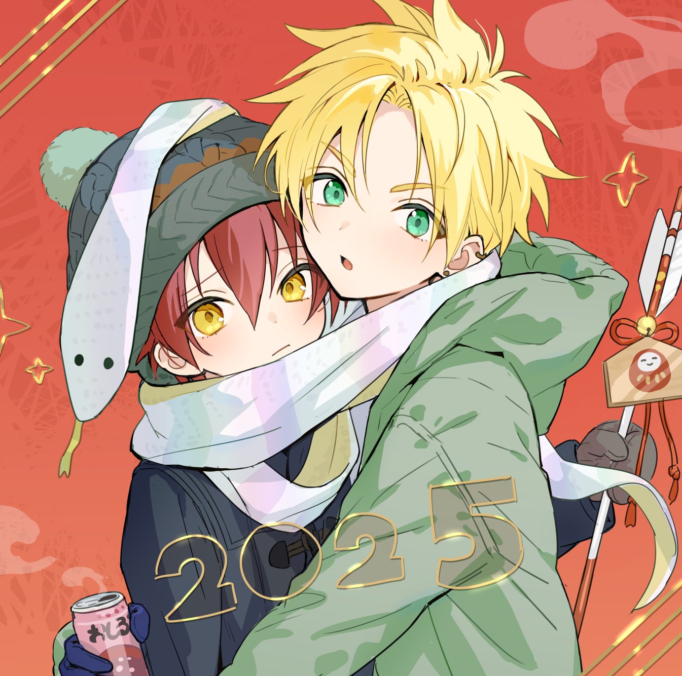 2025 2boys arrow_(projectile) beanie blonde_hair blush can closed_mouth commentary ear_piercing ema green_eyes hamaya hat highres holding holding_can hood hood_down hooded_jacket jacket long_sleeves looking_at_viewer male_focus mittens multiple_boys new_year original parted_lips piercing pillow_(nutsfool) pom_pom_(clothes) pom_pom_beanie red_background red_hair scarf shared_clothes shared_scarf simple_background snake spiked_hair untranslatable_commentary upper_body yellow_eyes