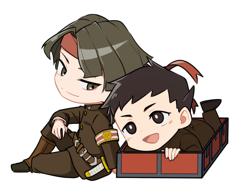 2boys ace_attorney arm_on_knee armband belt black_footwear black_hair bright_pupils brown_eyes brown_hair brown_jacket brown_pants chibi full_body grey_eyes headband jacket kazuma_asogi korean_commentary looking_at_another lying male_focus multiple_boys on_stomach pants pazspi red_headband ryunosuke_naruhodo short_hair simple_background sitting smile the_great_ace_attorney white_background white_pupils