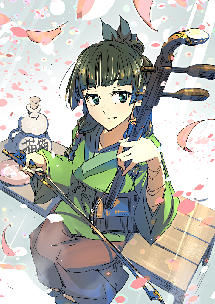 1girl blue_footwear bottle chair cup erhu falling_petals freckles green_eyes green_hair green_shirt instrument kusuriya_no_hitorigoto light_rays looking_at_object maomao_(kusuriya_no_hitorigoto) petals pink_petals sakazuki sake_bottle shirt sitting skirt solo supe_(yuusyasupepen) clothes_writing twintails wooden_chair