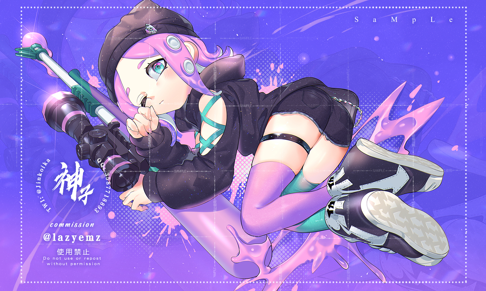 1girl :/ artist_name asymmetrical_legwear beanie black_hat black_hoodie black_shoes black_shorts blue_eyes blue_thighhighs closed_mouth clothing_cutout commentary commission commissioner_name cross-laced_clothes cross-laced_cutout denim denim_shorts full_body hand_on_own_face hat high_tops highres holding holding_weapon hood hood_down hoodie jinkoika long_sleeves medium_hair mismatched_legwear multicolored_eyes multicolored_hair nintendo octoling octoling_girl octoling_player_character one_eye_closed pink_eyes pink_hair pink_thighhighs purple_background purple_hair sample_watermark scope shoes short_shorts shorts shoulder_cutout skindentation sneakers solo splat_charger_(splatoon) splatoon_(series) swept_bangs untranslatable_commentary tentacle_hair thigh_strap thighhighs two-tone_eyes two-tone_hair watermark weapon