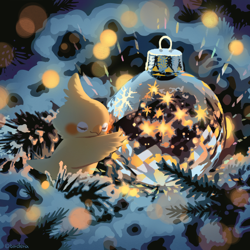 animal_focus bird blurry bokeh christmas christmas_ornaments christmas_tree cockatiel depth_of_field era_(traveling_bird) no_humans original solo twitter_username