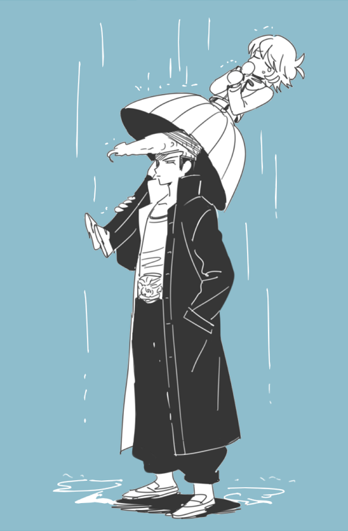 2boys blue_background carrying carrying_person coat crossdressing crossdressing_(mtf) danganronpa:_trigger_happy_havoc danganronpa_(series) dg_xhs fujisaki_chihiro full_body greyscale_with_colored_background hand_in_pocket improvised_umbrella long_sleeves male_focus multiple_boys open_clothes open_coat owada_mondo pants pleated_skirt pompadour rain shirt shoes short_hair skirt standing trap