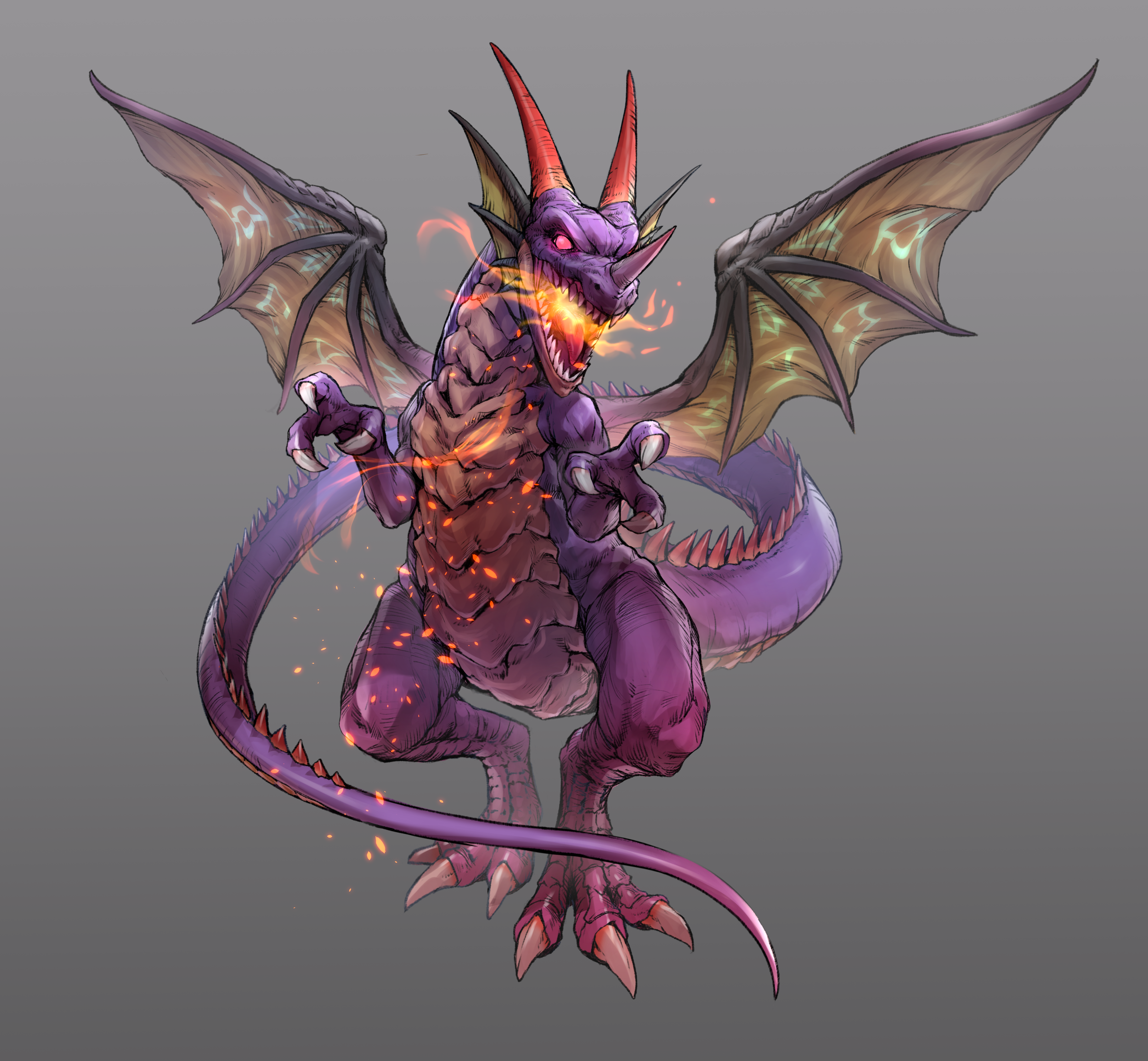 1boy absurdres bat_wings breath_weapon breathing_fire claws commentary_request dragon dragon_lord dragon_quest dragon_quest_i fins fire full_body gradient_background grey_background head_fins highres horns incoming_attack kurosaki_yo looking_at_viewer male_focus monster monster_focus no_humans no_pupils nose_horn one_eye_covered open_mouth orange_horns partial_commentary pink_eyes purple_scales solo tail transformation wings