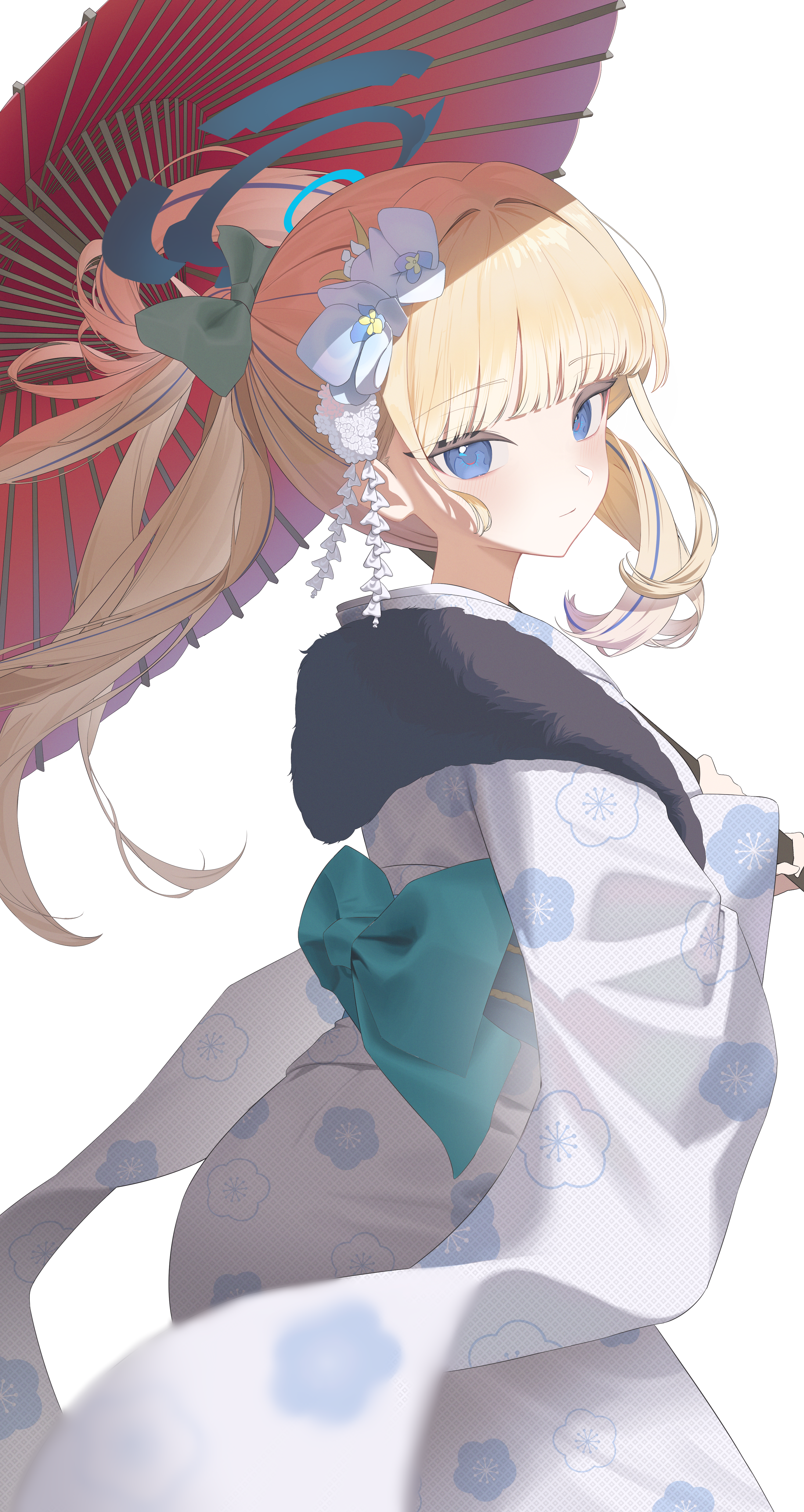 1girl absurdres alternate_costume alternate_hairstyle blonde_hair blue_archive blue_eyes blue_hair blue_halo blunt_bangs blurry closed_mouth commentary depth_of_field expressionless floral_print flower from_behind hair_flower hair_ornament halo highres holding holding_umbrella japanese_clothes kimono looking_at_viewer looking_back multicolored_hair oil-paper_umbrella ponytail print_kimono september0405 solo streaked_hair toki_(blue_archive) umbrella white_kimono