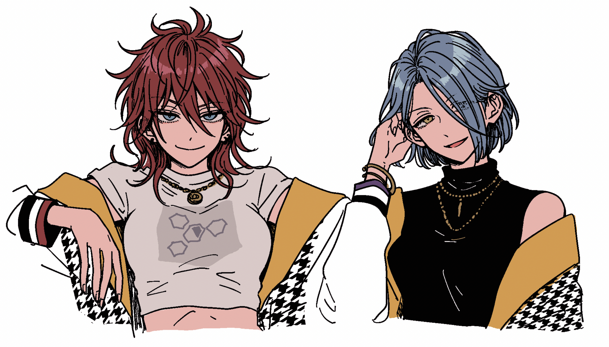 2girls amagi_rinne arm_rest black_shirt blue_eyes bracelet breasts closed_mouth commentary_request cropped_shirt ear_piercing ensemble_stars! eyelashes fingernails flat_color genderswap genderswap_(mtf) grey_shirt hair_between_eyes hair_over_one_eye hand_in_own_hair head_tilt highres himeru_(ensemble_stars!) jacket jewelry long_bangs looking_at_viewer medium_breasts medium_hair mo_ja multiple_girls multiple_piercings necklace open_clothes open_jacket open_mouth piercing raised_eyebrow red_hair shirt short_sleeves simple_background single_bare_shoulder smile straight_hair tsurime turtleneck turtleneck_shirt upper_body wavy_hair white_background white_jacket yellow_eyes