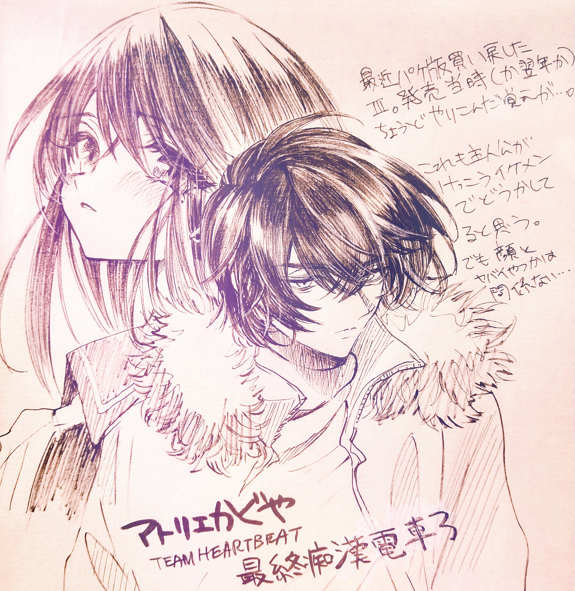 1boy 1girl aya_carmine character_request commentary_request expressionless fur_collar greyscale highres jacket long_hair monochrome saishuu_chikan_densha_(series) saishuu_chikan_densha_3 sketch traditional_media translation_request upper_body