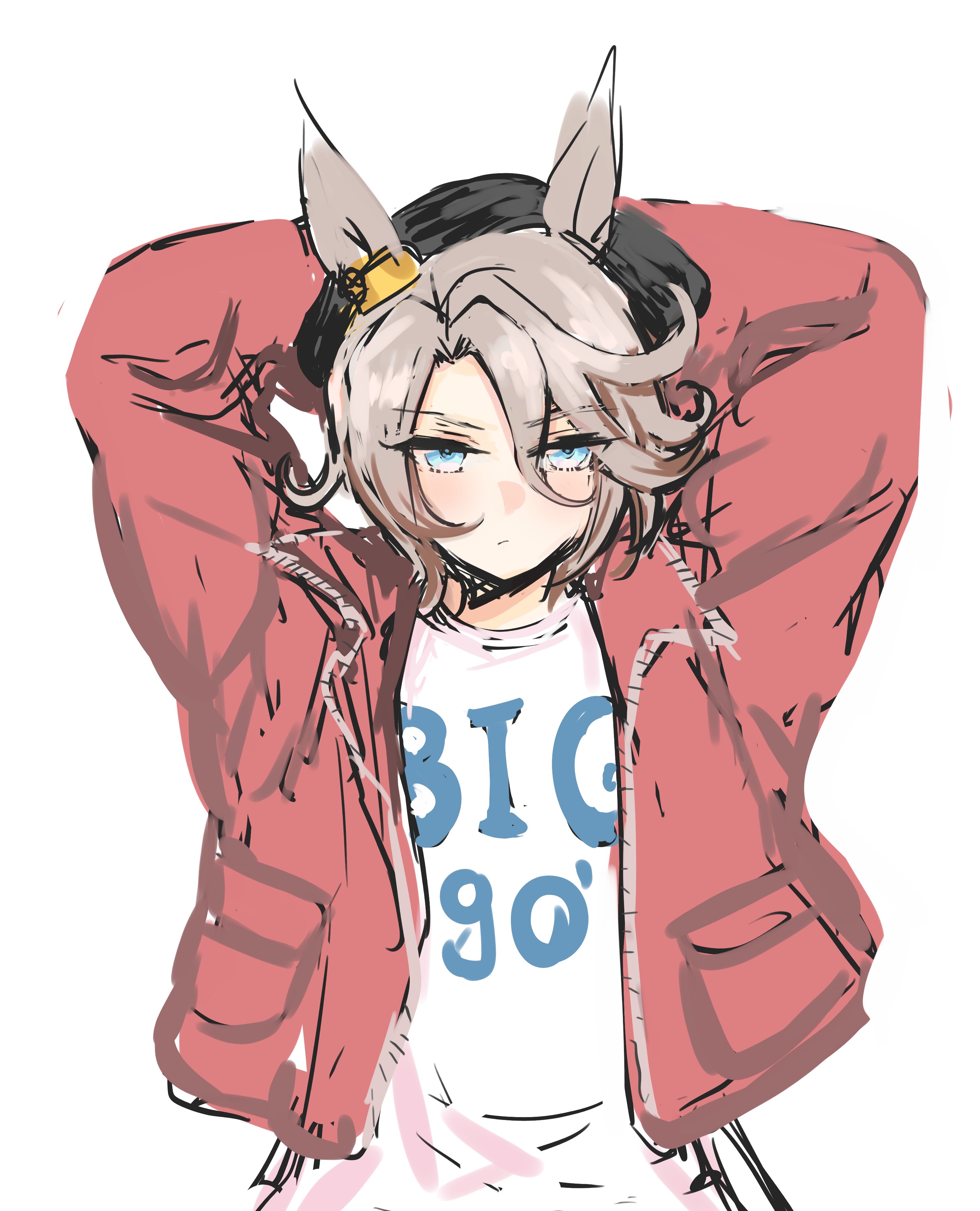 1girl absurdres alternate_costume animal_ears arms_behind_head beret blue_eyes english_text hat highres horse_ears horse_girl jacket looking_at_viewer narita_taishin_(umamusume) red_jacket shimura_(hosshi) shirt solo swept_bangs umamusume white_background white_shirt