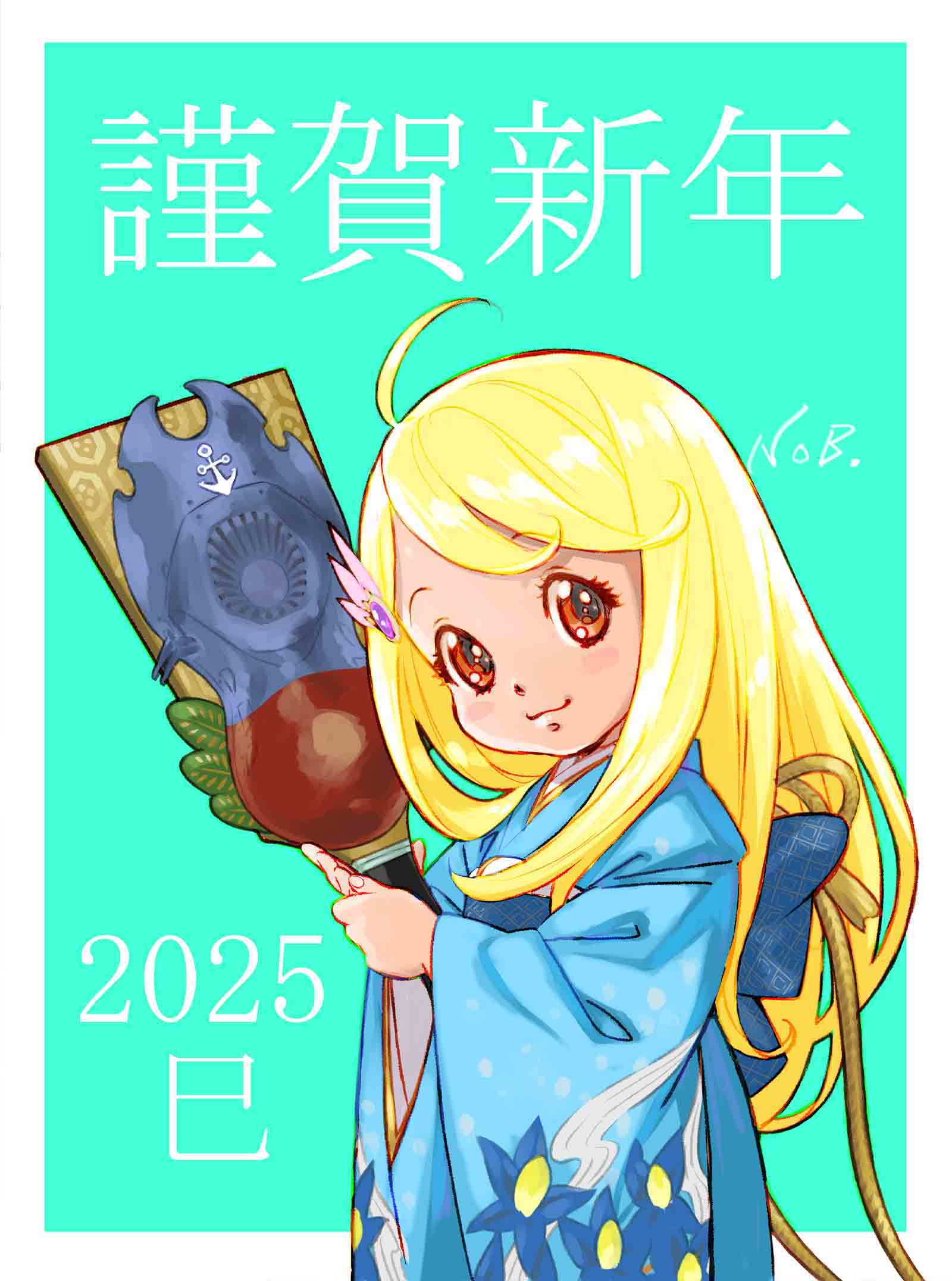 ahoge blonde_hair blue_kimono child floral_print floral_print_kimono hair_ornament hanetsuki highres japanese_clothes kimono kodai_sasha looking_at_viewer print_kimono smile uchuu_senkan_yamato yamato_(uchuu_senkan_yamato) yuuki_nobuteru