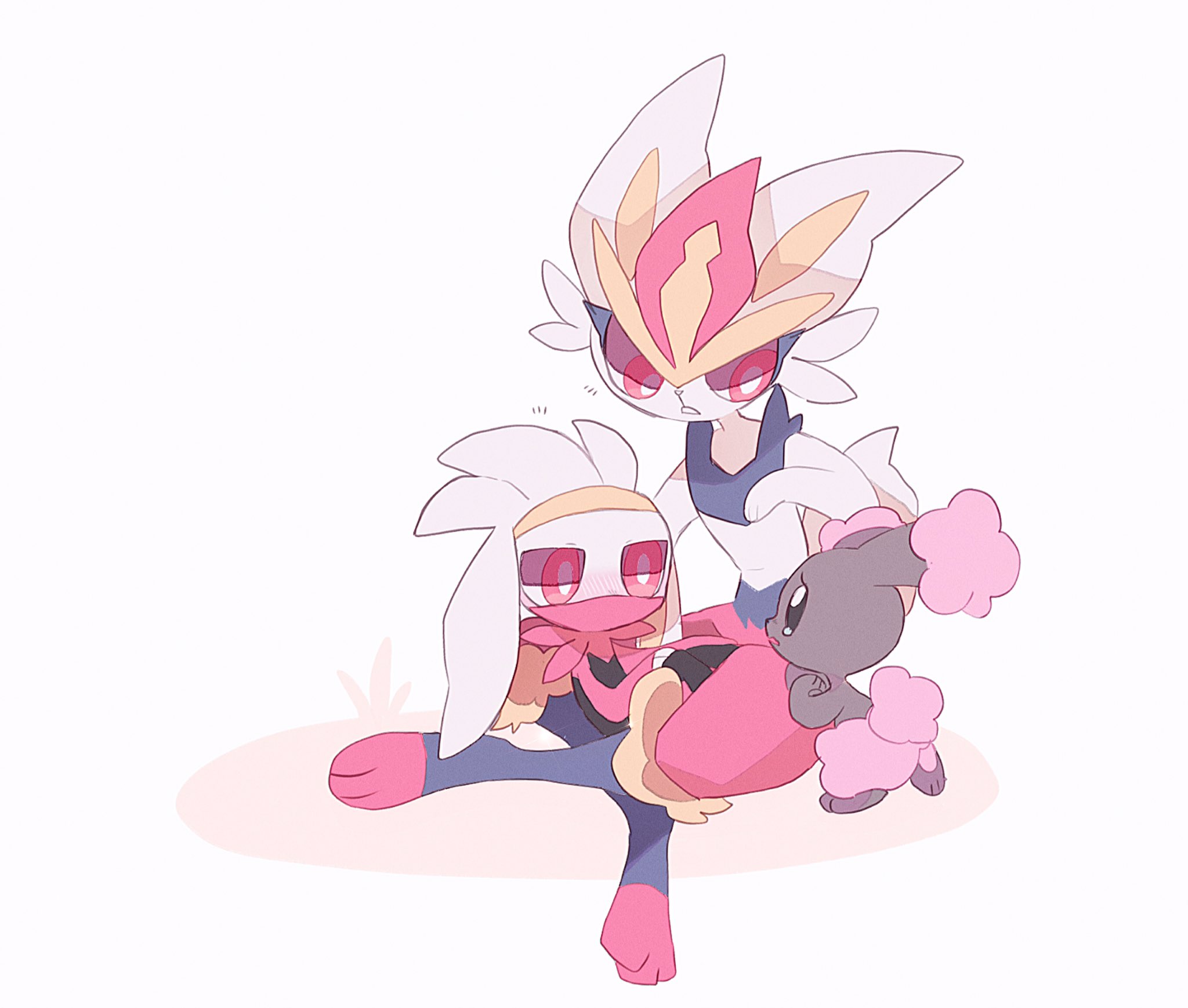 1girl 2boys alternate_color animal_ears animal_hands black_eyes body_fur bright_pupils brown_fur buneary cinderace full_body furry furry_female gen_4_pokemon gen_8_pokemon highres looking_at_another masayo_(skip) multiple_boys nintendo pink_fur pokemon pokemon_(creature) rabbit_ears rabbit_girl rabbit_tail raboot red_eyes red_hair shiny_pokemon simple_background sitting tail white_background white_fur white_pupils
