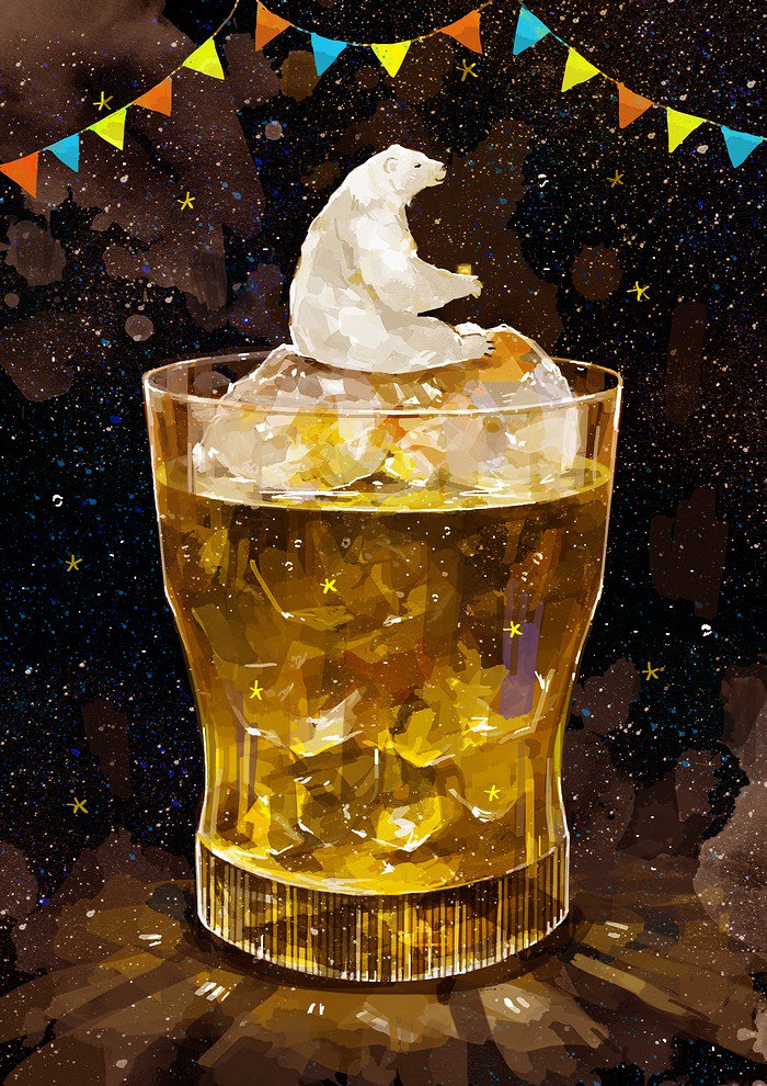 alcohol animal bear commentary_request cup ice night nomiya_(no_38) original polar_bear sky solo_focus whiskey