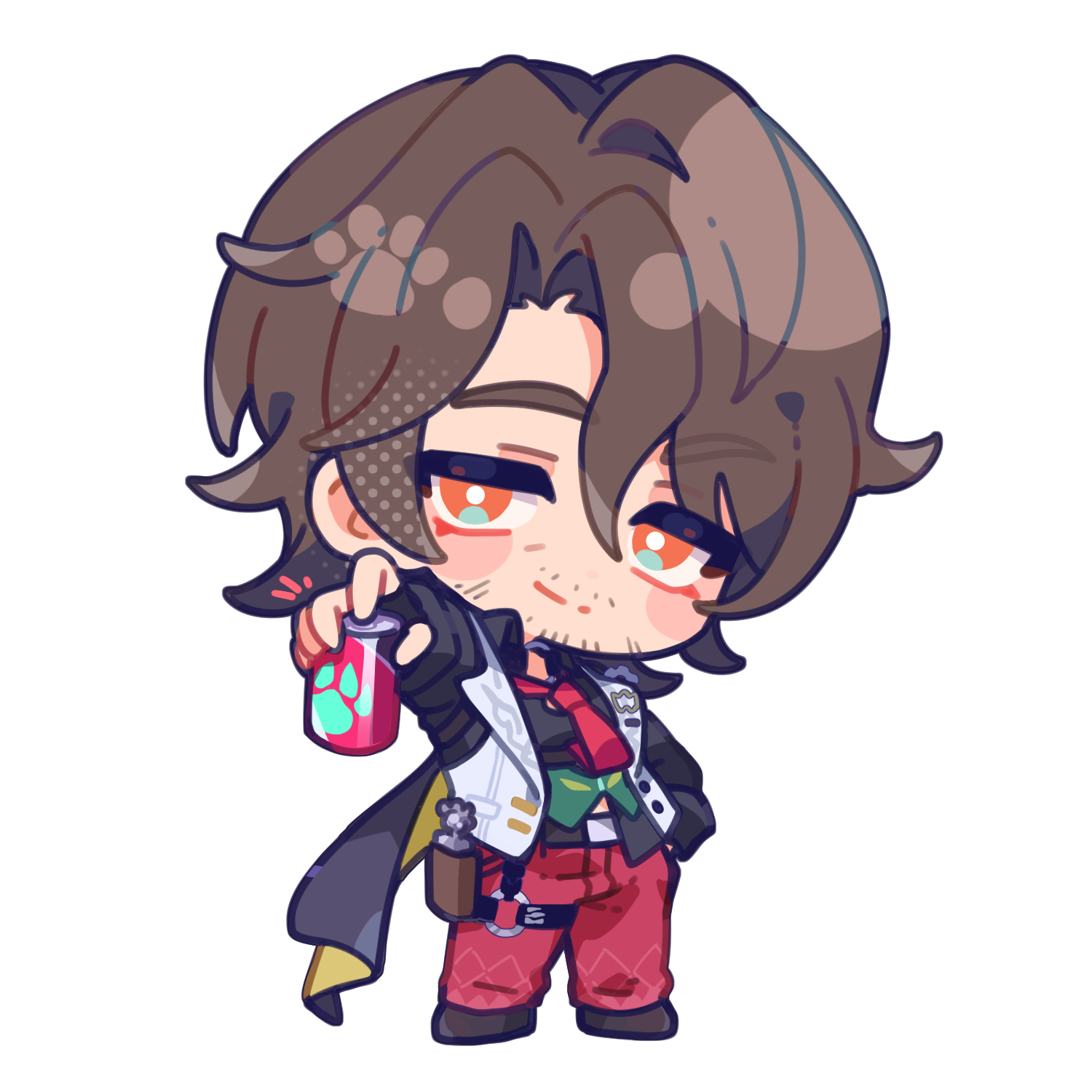 1boy black_gloves black_shirt blush_stickers brown_hair can chibi commentary_request drink_can facial_hair fingerless_gloves gallagher_(honkai:_star_rail) gloves highres holding holding_can honkai:_star_rail honkai_(series) long_sleeves looking_at_viewer male_focus necktie nekoma_hikaru orange_eyes pants red_necktie red_pants shirt simple_background smile soda_can solo stubble thigh_strap vest white_background white_vest