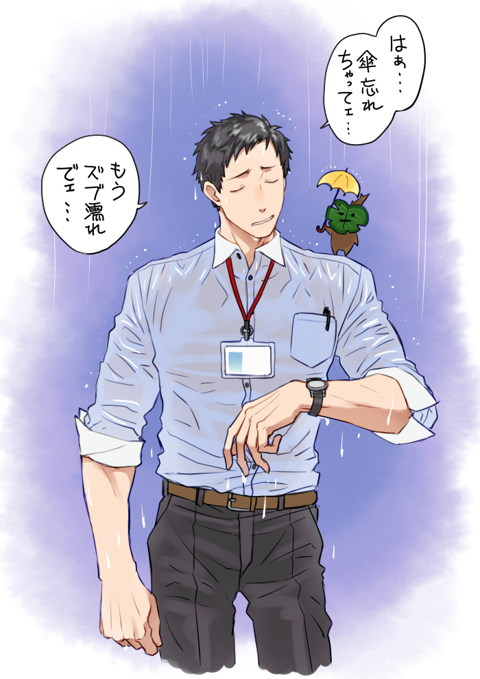 1boy belt belt_buckle black_hair black_pants blue_background blue_shirt breast_pocket brown_belt buckle buttons closed_eyes collared_shirt commentary_request cowboy_shot hand_up holding holding_umbrella id_card korok lanyard male_focus nijisanji nintendo on_shoulder pants parted_lips pen pocket rain raised_eyebrows shirt shirt_tucked_in short_hair three-quarter_sleeves solo speech_bubble standing succo_gura the_legend_of_zelda translation_request umbrella very_short_hair virtual_youtuber watch wet wet_clothes wet_shirt white_background wing_collar wristwatch yashiro_kizuku yashiro_kizuku_(1st_costume) yellow_umbrella