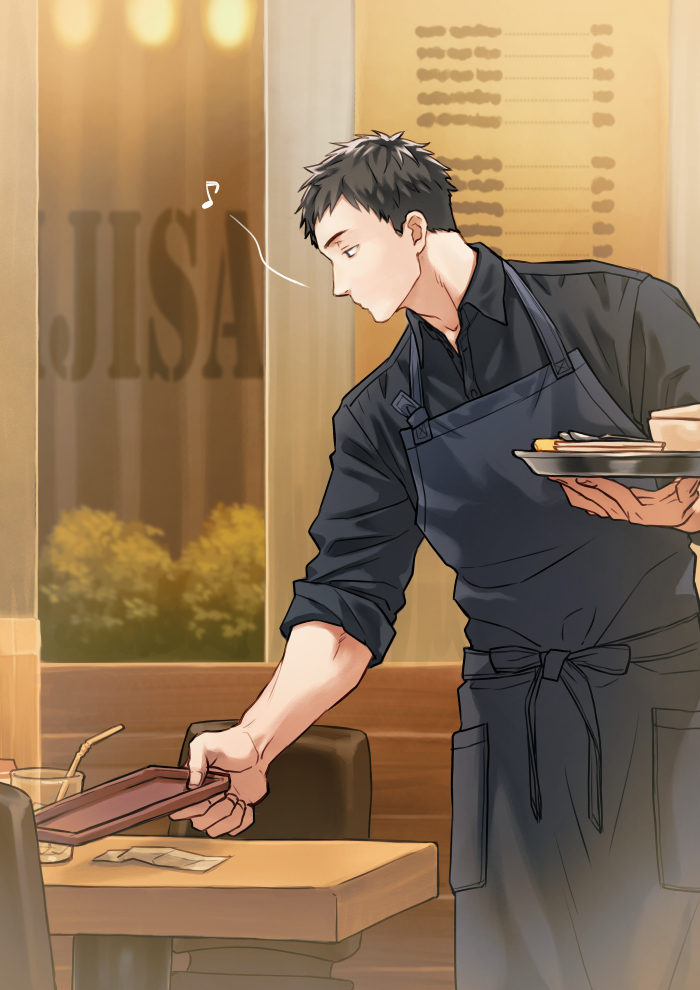 1boy apron black_apron black_eyes black_hair black_shirt bowl bush buttons chair collared_shirt commentary_request cup drinking_straw hand_up holding holding_tray ice ice_cube indoors looking_down looking_to_the_side male_focus menu musical_note nijisanji plate restaurant shirt short_hair sleeves_rolled_up solo spoon standing succo_gura table tray very_short_hair virtual_youtuber whistling window wing_collar yashiro_kizuku