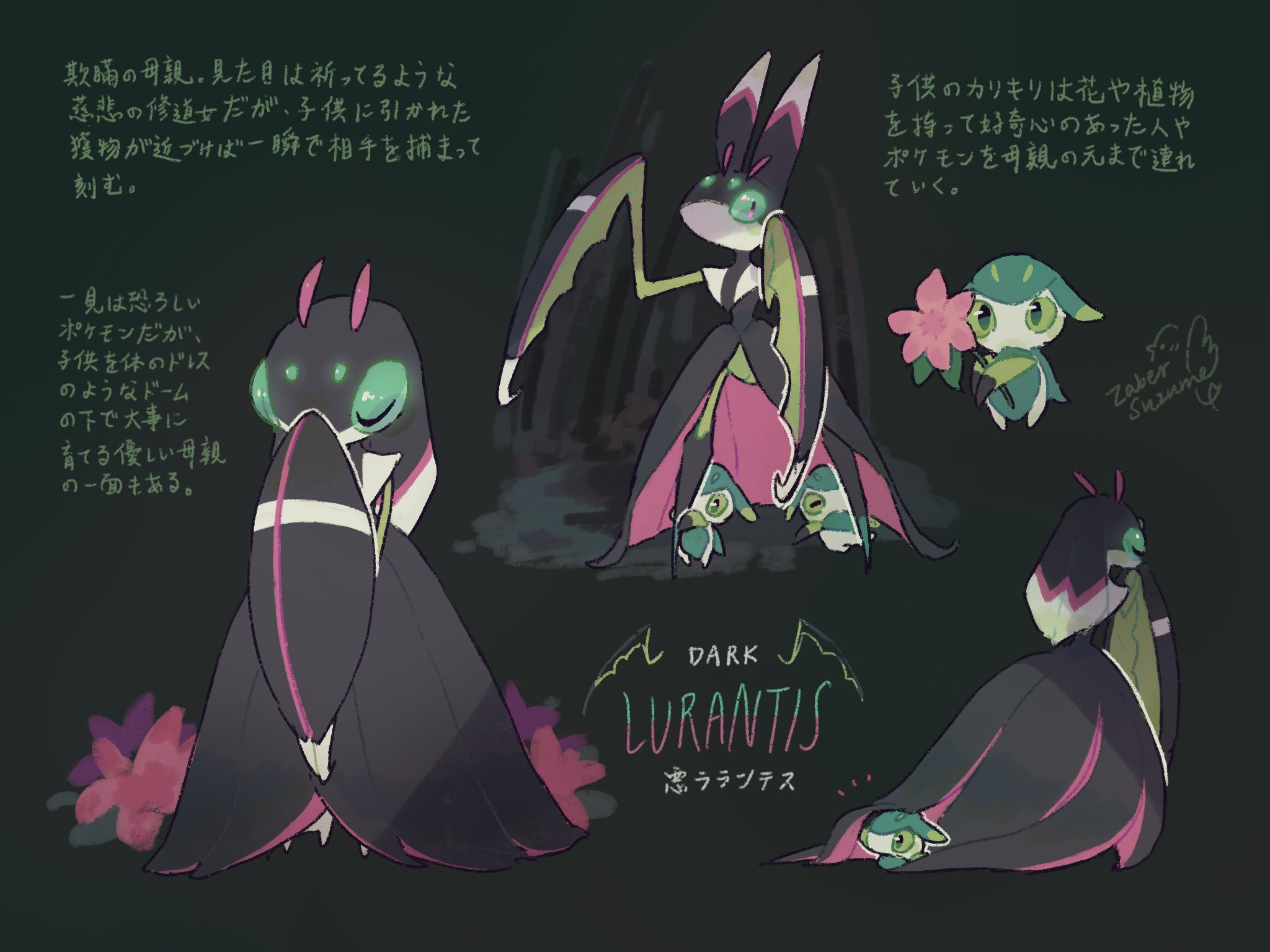 1girl alternate_form antennae arthropod_girl arthropod_limbs black_dress black_skin colored_skin dress fakemon flower fomantis full_body furry furry_female gen_7_pokemon green_eyes highres looking_at_viewer lurantis mantis_girl monster_girl nintendo no_mouth pink_flower plant_girl pokemon pokemon_(creature) praying_mantis simple_background standing white_skin zaber_(littlesuzume)