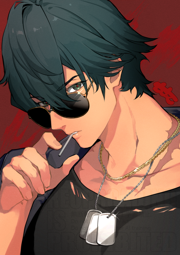 1boy black_hair black_shirt blue_hair candy chain chain_necklace choco_c14 commentary_request dog_tags food green_eyes hair_between_eyes jewelry lighter_(zenless_zone_zero) lollipop looking_at_viewer male_focus necklace red_background shirt simple_background solo sparkle sunglasses torn_clothes upper_body zenless_zone_zero