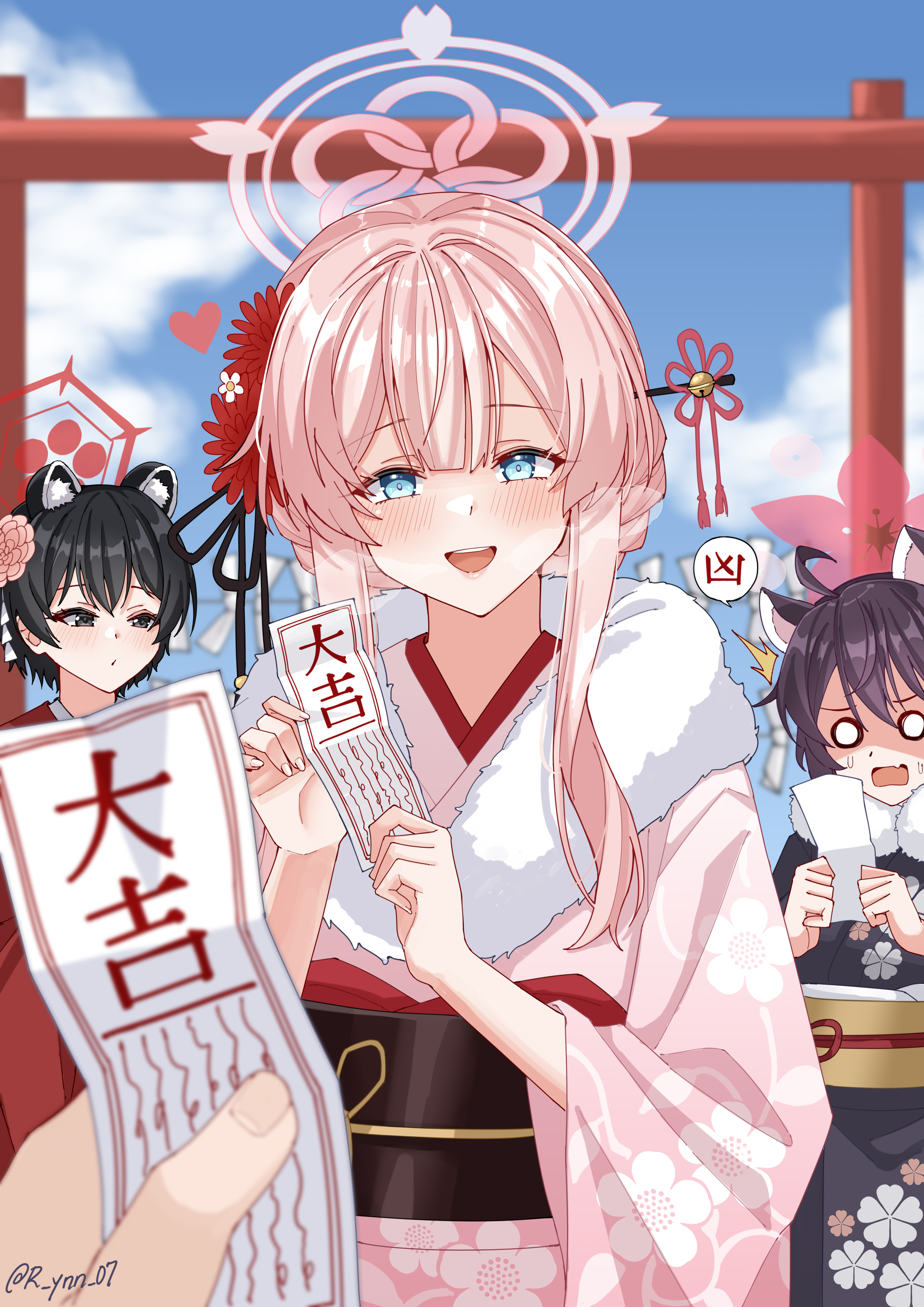 3girls absurdres alternate_costume animal_ear_fluff animal_ears black_hair black_kimono black_sash blue_archive blue_eyes blush extra_ears floral_print floral_print_kimono flower fur_trim grey_eyes hair_between_eyes hair_flower hair_ornament highres holding holding_omikuji holding_paper japanese_clothes kaede_(blue_archive) kimono long_hair looking_at_object mimori_(blue_archive) multiple_girls obi omikuji open_mouth paper pink_flower pink_hair pink_kimono pov print_kimono purple_hair raccoon_ears red_kimono rynn_(darknescorez) sash short_hair sidelocks torii translated tsubaki_(blue_archive) yellow_sash