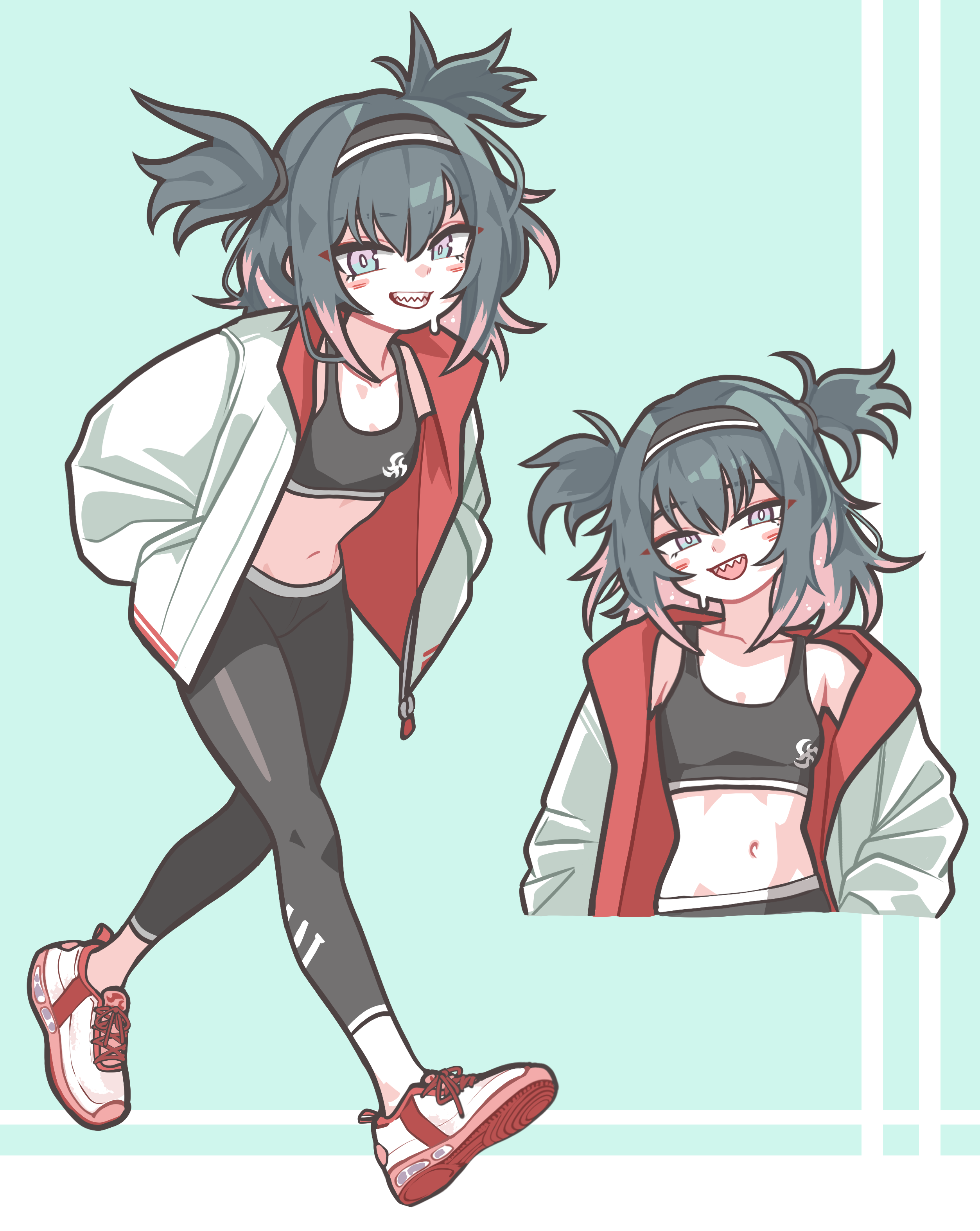 1girl absurdres black_hair black_hairband black_pants black_sports_bra black_survival blush breasts cleavage collarbone eternal_return:_black_survival full_body grin groin hairband hands_in_pockets highres hisui_(black_survival) jacket leaning_forward leggings looking_at_viewer medium_hair midriff multicolored_eyes multicolored_hair multicolored_jacket multiple_views navel open_clothes open_jacket open_mouth pants pink_eyes pink_hair sharp_teeth shoeguy shoes simple_background small_breasts smile sneakers sports_bra sweat sweatdrop teeth two_side_up walking white_jacket