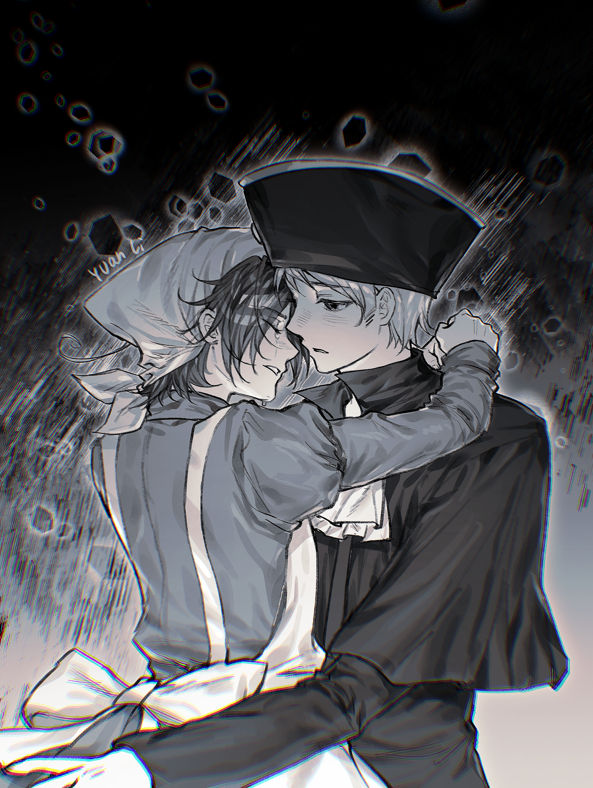 2boys absurdres aged_down ahoge apron ascot axis_powers_hetalia capelet child closed_mouth crossdressing crossdressing_(mtf) crying greyscale hat headdress highres holy_roman_empire_(hetalia) hug juliet_sleeves long_sleeves maid male_focus male_maid monochrome multiple_boys northern_italy_(hetalia) puffy_sleeves short_hair upper_body yuanli804
