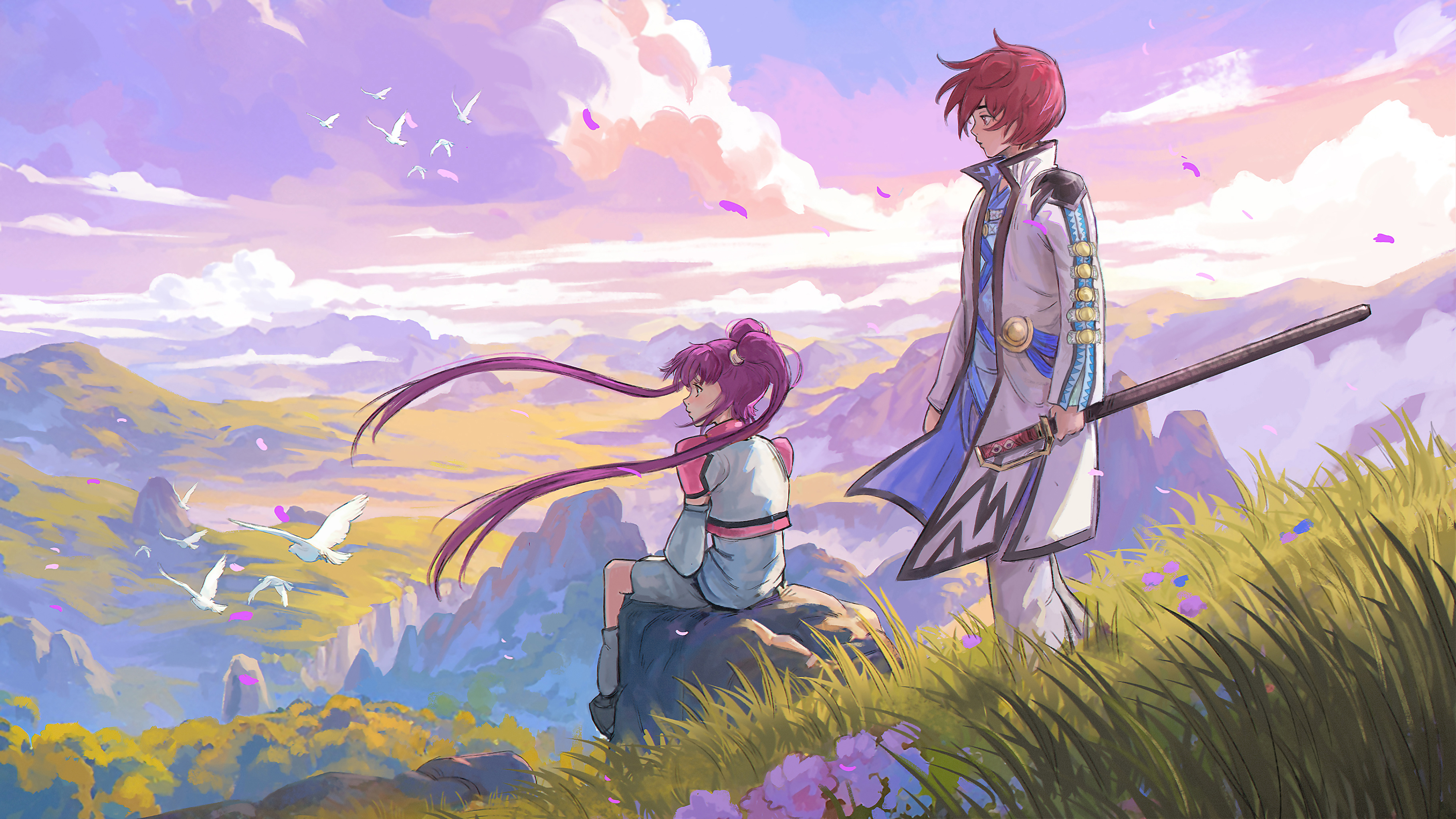 1boy 1girl absurdres art_of_papayou asbel_lhant bird blush brown_hair cloud cloudy_sky detached_sleeves dress falling_petals field flower highres holding holding_sword holding_weapon long_hair official_alternate_costume on_rock petals purple_eyes purple_hair second-party_source sheath sheathed short_hair sky sophie_(tales) standing sword tales_of_(series) tales_of_graces twintails weapon