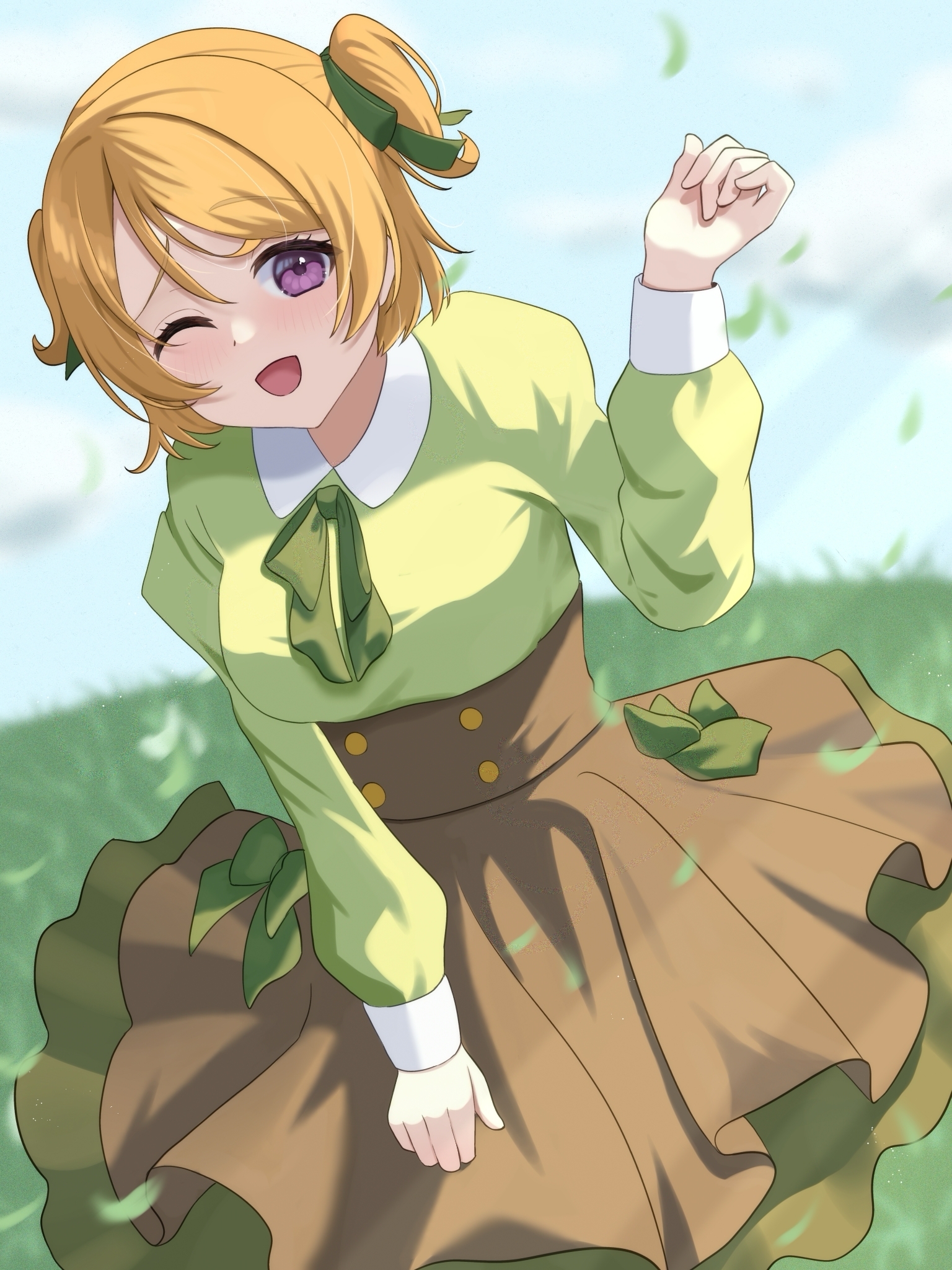1girl autumn_leaves brown_hair dress green_dress hand_up highres koizumi_hanayo leaf long_sleeves looking_at_viewer love_live! one_eye_closed open_mouth outdoors purple_eyes short_hair smile solo soubi_0202 wink