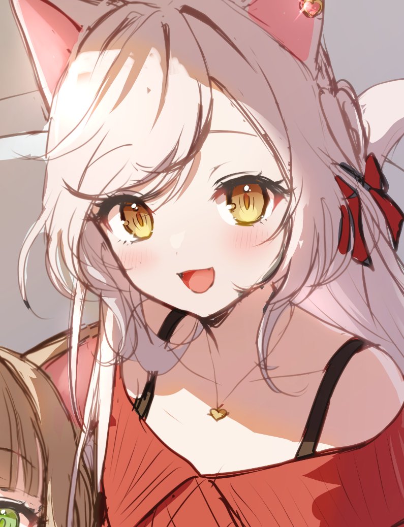 :d animal_ears blush cat_ears cat_girl jewelry long_hair looking_at_viewer momoshiki_tsubaki off_shoulder open_mouth sketch smile unfinished white_hair yellow_eyes