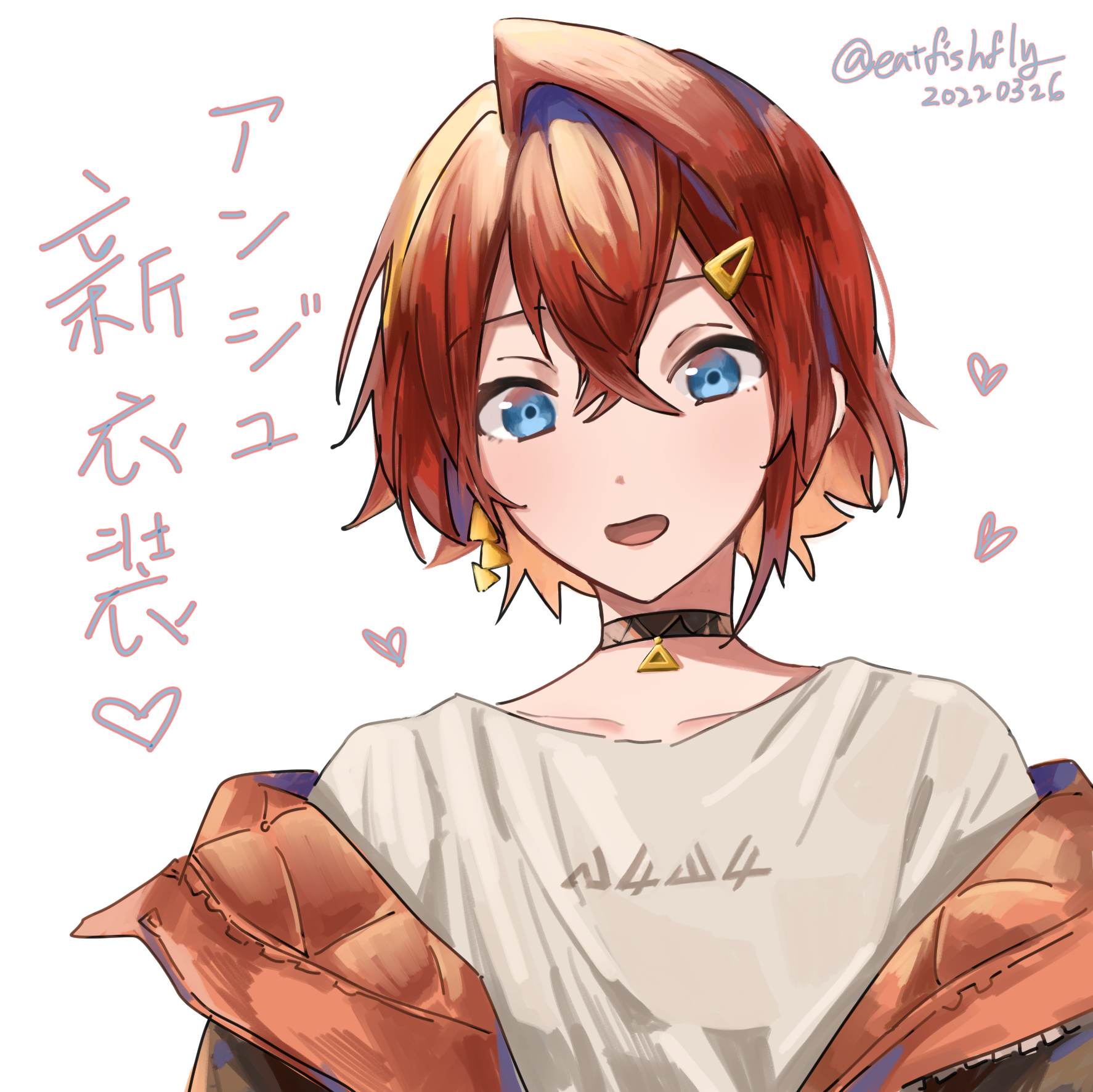 1girl aji_(eatfishfly) ange_katrina ange_katrina_(casual) black_choker black_jacket blue_eyes choker collarbone commentary_request crossed_bangs dated earrings flat_chest hair_between_eyes hair_ornament hairclip heart highres jacket jewelry light_blush long_bangs looking_at_viewer multicolored_jacket nijisanji off_shoulder open_clothes open_jacket open_mouth orange_jacket pendant_choker red_hair shirt short_hair simple_background single_earring single_hair_intake smile solo t-shirt translation_request triangle_earrings twitter_username two-tone_jacket upper_body virtual_youtuber white_background white_shirt