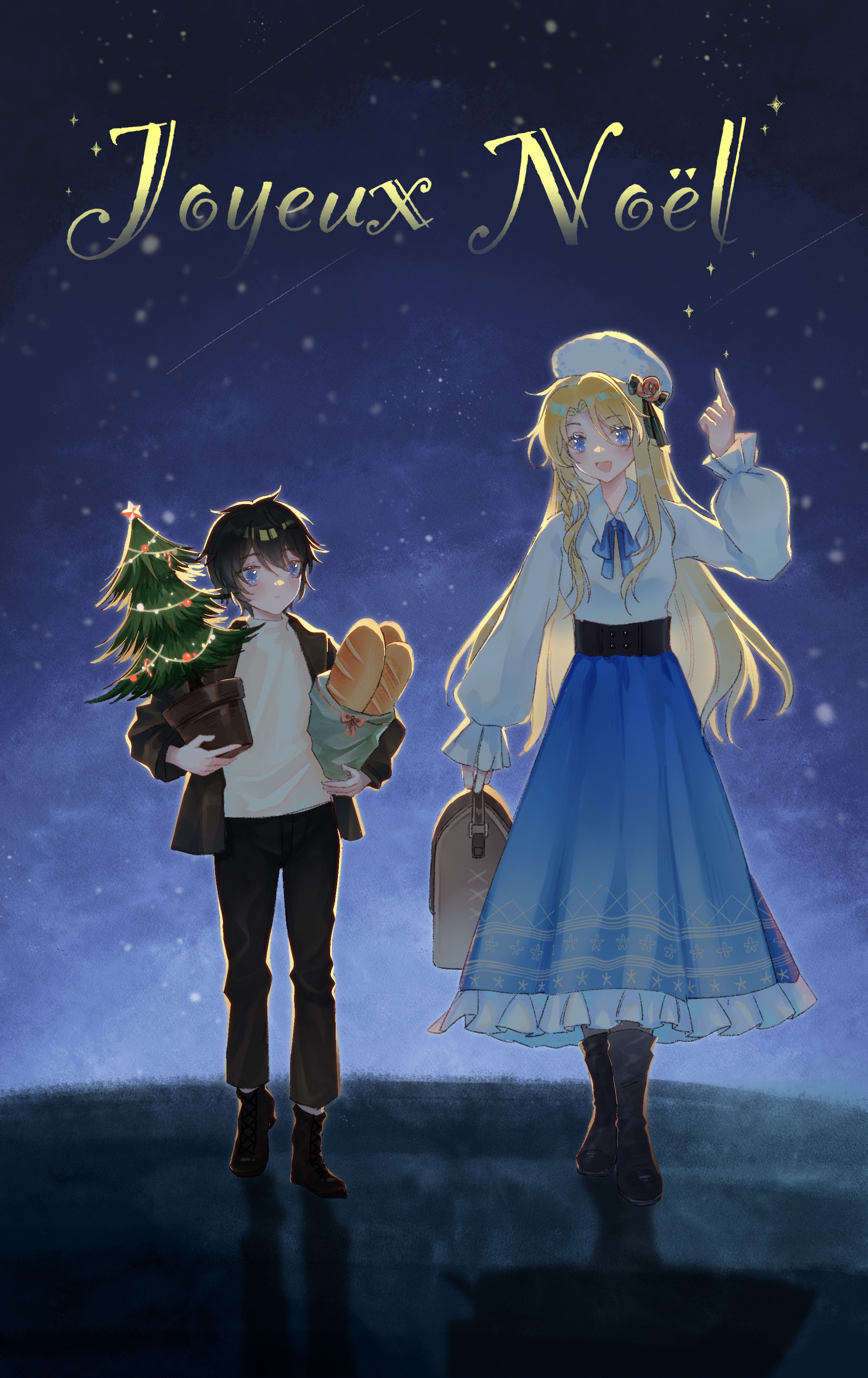 1boy 1girl absurdres aurore_lee bag baguette beret black_bow black_corset black_footwear black_hair black_jacket black_pants blue_bow blue_bowtie blue_eyes blue_skirt boots bow bowtie braid bread brown_bag buttons chinese_commentary christmas christmas_ornaments christmas_star christmas_tree circle_of_inevitability closed_mouth collared_jacket collared_shirt commentary_request corset expressionless flower food french_text frilled_skirt frilled_sleeves frills full_body grey_pantyhose hair_between_eyes handbag hat hat_bow hat_flower high-waist_skirt highres holding holding_bag holding_food holding_plant jacket lapels lian_yu light_blush long_skirt long_sleeves lord_of_the_mysteries lower_teeth_only lumian_lee night open_clothes open_jacket open_mouth outdoors pants pantyhose peaked_lapels pink_flower pink_rose plant pleated_skirt pointing pointing_up potted_plant puffy_long_sleeves puffy_sleeves red_bow red_bowtie rose shadow shirt shoes shooting_star sidelocks single_braid single_stripe skirt sky sleeves_past_wrists smile snowflake_print standing star_(sky) starry_sky striped_bow teeth translated turtleneck turtleneck_shirt wavy_hair white_hat white_shirt