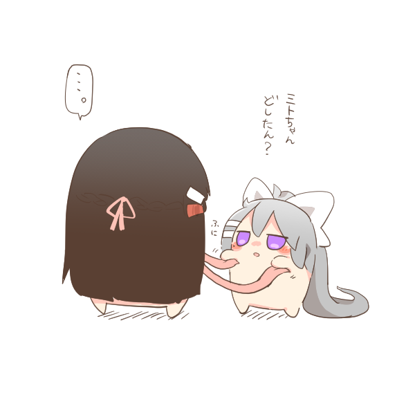 ... 2girls black_hair blush_stickers braid chibi commentary_request grey_hair hair_ornament hair_ribbon hairclip higuchi_kaede kaede-chan_(higuchi_kaede) long_hair mito-chan_(tsukino_mito) mito_and_kaede mole mole_under_eye multiple_girls nijisanji pink_ribbon ponytail purple_eyes rebecca_(keinelove) ribbon simple_background spoken_ellipsis standing translation_request tsukino_mito very_long_hair virtual_youtuber white_background white_ribbon