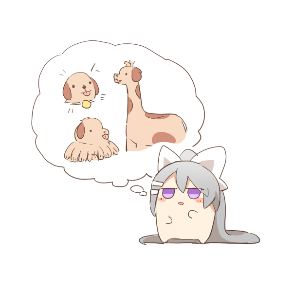1girl animal blush_stickers chibi dog fusion giraffe grey_hair hair_ornament hair_ribbon hairclip higuchi_kaede imagining kaede-chan_(higuchi_kaede) long_hair mito_and_kaede mole mole_under_eye nijisanji octopus parted_lips ponytail purple_eyes rebecca_(keinelove) ribbon simple_background solo standing very_long_hair virtual_youtuber white_background white_ribbon