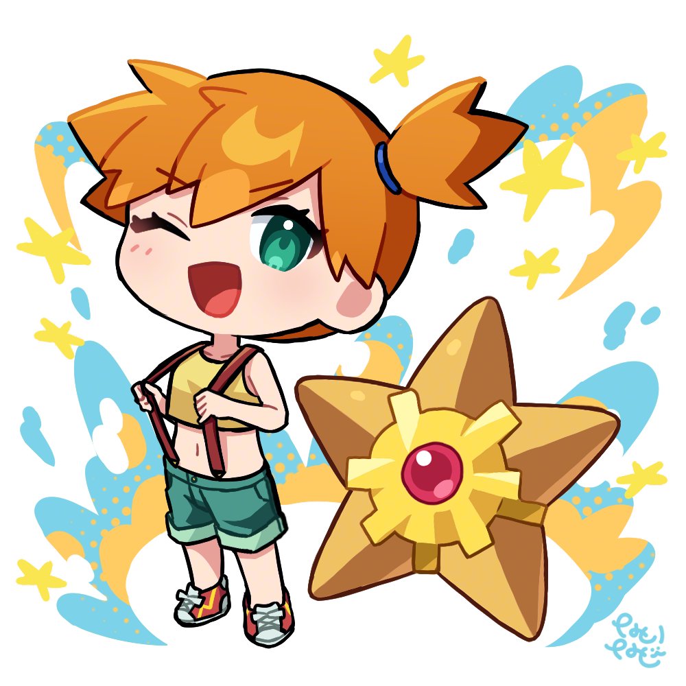 1girl ;d artist_name asymmetrical_hair blush breasts chibi crop_top denim denim_shorts eyelashes full_body gen_1_pokemon green_eyes green_shorts gym_leader hair_tie legs looking_at_viewer midriff misty_(pokemon) natori_nato navel nintendo one_eye_closed open_mouth orange_hair pokemon pokemon_(anime) pokemon_(classic_anime) ponytail red_shoes shirt shoes short_hair short_shorts shorts side_ponytail signature simple_background sleeveless smile sneakers solo standing star_(symbol) staryu suspender_shorts suspenders tank_top thighs wink yellow_shirt