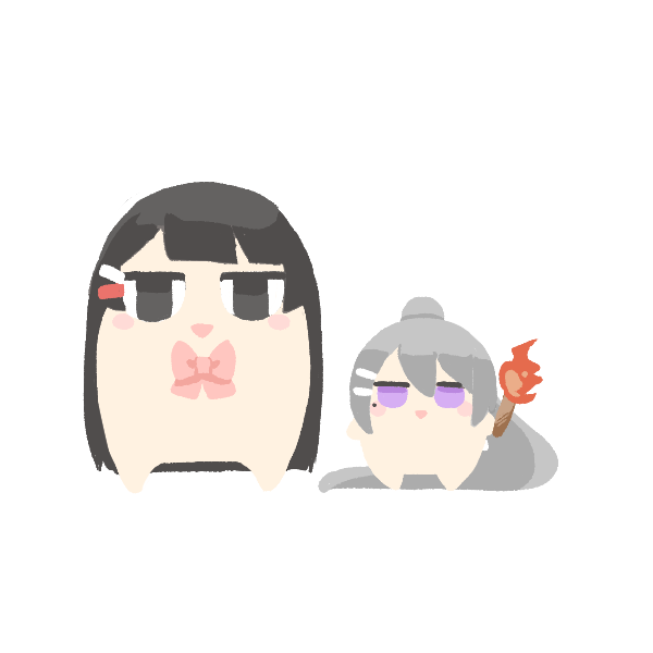 2girls :> black_hair bow chibi grey_hair hair_between_eyes hair_ornament hairclip higuchi_kaede holding kaede-chan_(higuchi_kaede) long_hair mito-chan_(tsukino_mito) mito_and_kaede mole mole_under_eye multiple_girls nijisanji parted_lips pink_bow ponytail purple_eyes rebecca_(keinelove) simple_background standing torch triangle_mouth tsukino_mito very_long_hair virtual_youtuber white_background