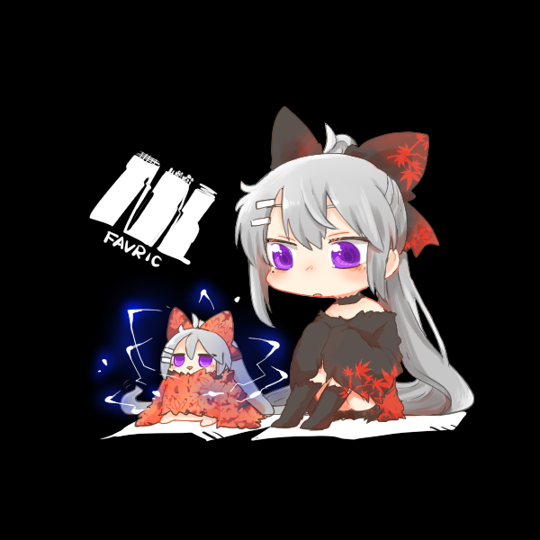 2girls :> bare_shoulders black_background black_dress black_ribbon black_socks blush_stickers chibi dress electricity eyebrows_hidden_by_hair grey_hair hair_between_eyes hair_ornament hair_ribbon hairclip higuchi_kaede kaede-chan_(higuchi_kaede) knees_up leaf_print mito_and_kaede mole mole_under_eye multiple_girls nijisanji off_shoulder parted_lips ponytail print_dress purple_eyes rebecca_(keinelove) ribbon shadow simple_background sitting socks triangle_mouth virtual_youtuber